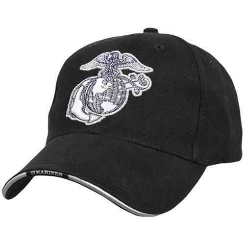 Front Panel With Buckram Sweatband Brushed Cotton Twill + PVC + Foam Front Panel With Embroidered Globe & Anchor Logo Silver Color Embroidery Silver Sandwich Brim Black Closure With Silver ''Marines'' Woven Label One Size Fits All Officially Licensed By U.S. Marines.