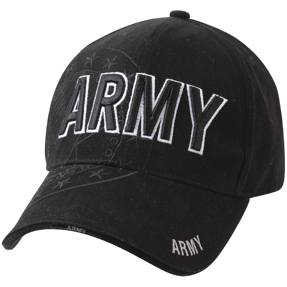100% Brushed Cotton Twill 108 X 56/16 X 7 , Black Cap With Raised, Embroidered Lettering - Army Eagle Shadow Embroidery On Front Panel/Brim , Sandwich Brim With 1 Pc. Woven Label â Army , Hook And Loop Closure With 1 Pc. Woven Label / Army , Upper Brim With Army Direct Embroidery.