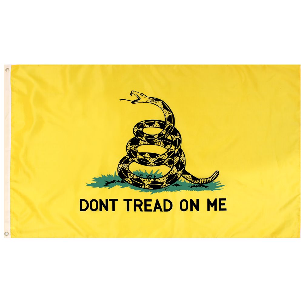 Show your stance with the bold and unmistakable Don't Tread On Me Flag, crafted for durability and symbolism. This yellow polyester flag displays the iconic Gadsden snake in vivid black and yellow, coiled above the famous motto “DON’T TREAD ON ME.” Built to last and easy to display, it’s a perfect flag for activists, freedom lovers, and patriots who want to express their values loud and clear. Whether mounted outside or hung inside, this flag demands attention and respect.