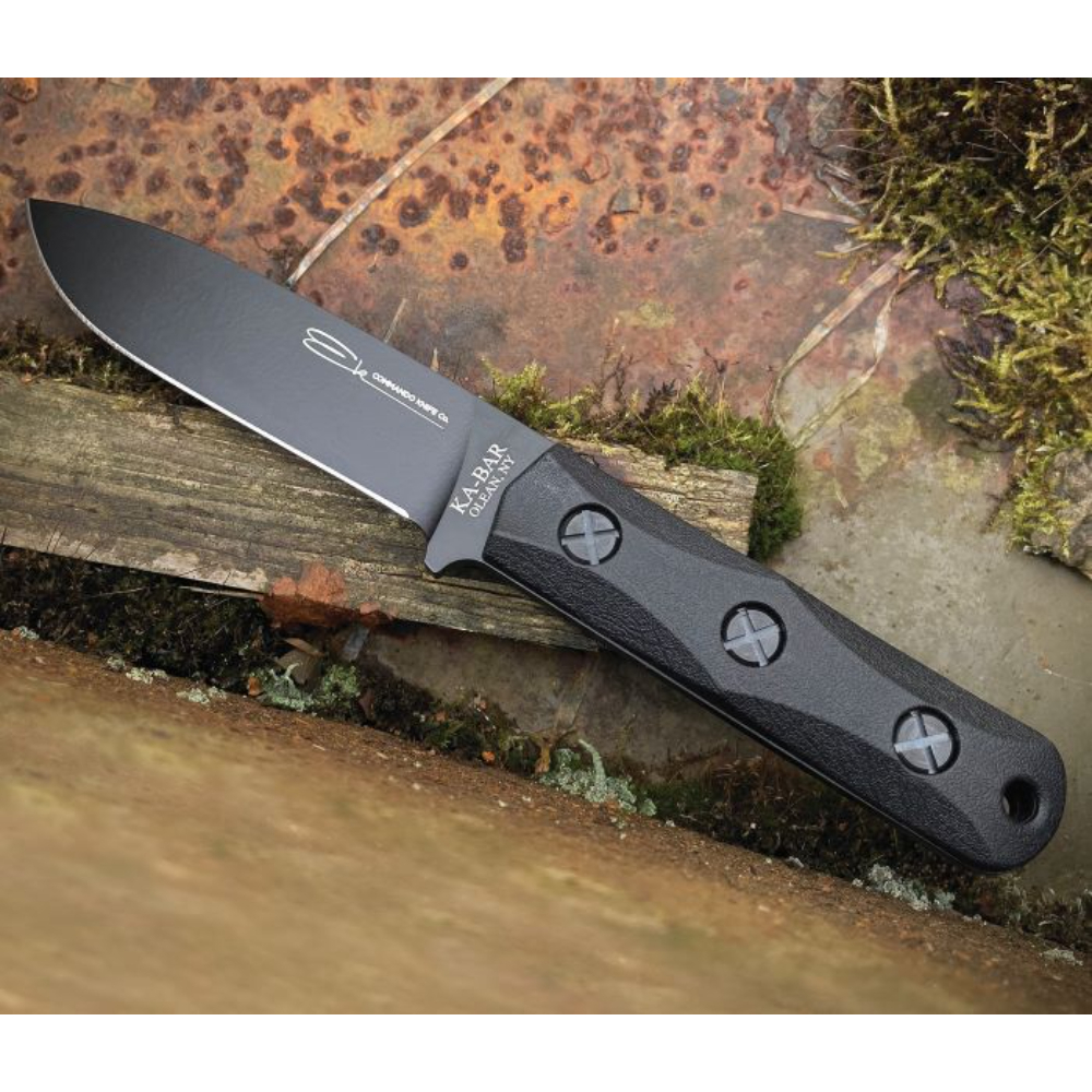 KA-BAR is excited to introduce the much anticipated John Ek Commando Knife Co. product, the Ek Model 51. This updated version of the occupational fighting knife is made from 1095 Cro-Van steel and features a black finished srop point blade measuring in at 5.06" in length. The textured Ultramid handles have four bevels that provide extra grip and are attached with traditional X-head fasteners and it has a small guard to prevent you from sliding forward onto the blade. The US-made Celcon sheath is a friction fit design with MOLLE compatibility and a belt loop. Every component of this knife is proudly made in the USA and this is both a great knife and a great value.