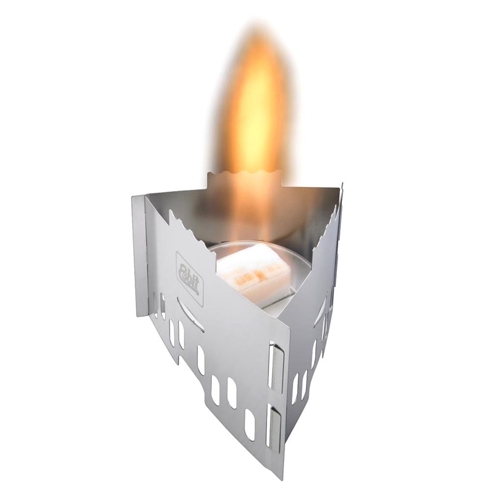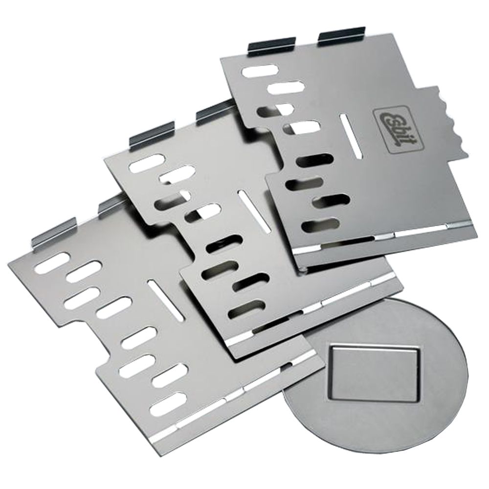 The take-apart, stainless steel Folding Pot Stand & Stove includes a tray for an Esbit solid fuel tablet. When put together, it provides a three-sided pot stand which will hold any pot that fits over a standard Nalgene® Bottle. The Folding Pot Stand & Stove is versatile so you can remove the tablet tray and snap in an Esbit Alcohol Burner. It's ultralight and very flat when taken apart and placed in the included pouch with belt loop. When disassembled and placed in the included pouch, the pouch will also hold six Esbit solid fuel tablets (not included).