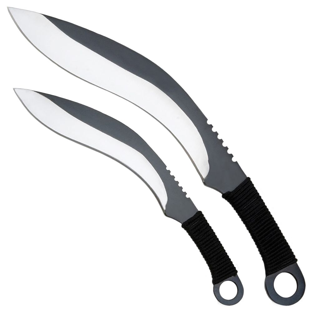 Each throwing kurkri features a full-tang AUS-6 stainless steel blade with a black anodized finish. The blade backs have been thumb plates ground into them for a steady hold and each handle offers a finger holes and a cord wrapped grip. Includes durable n