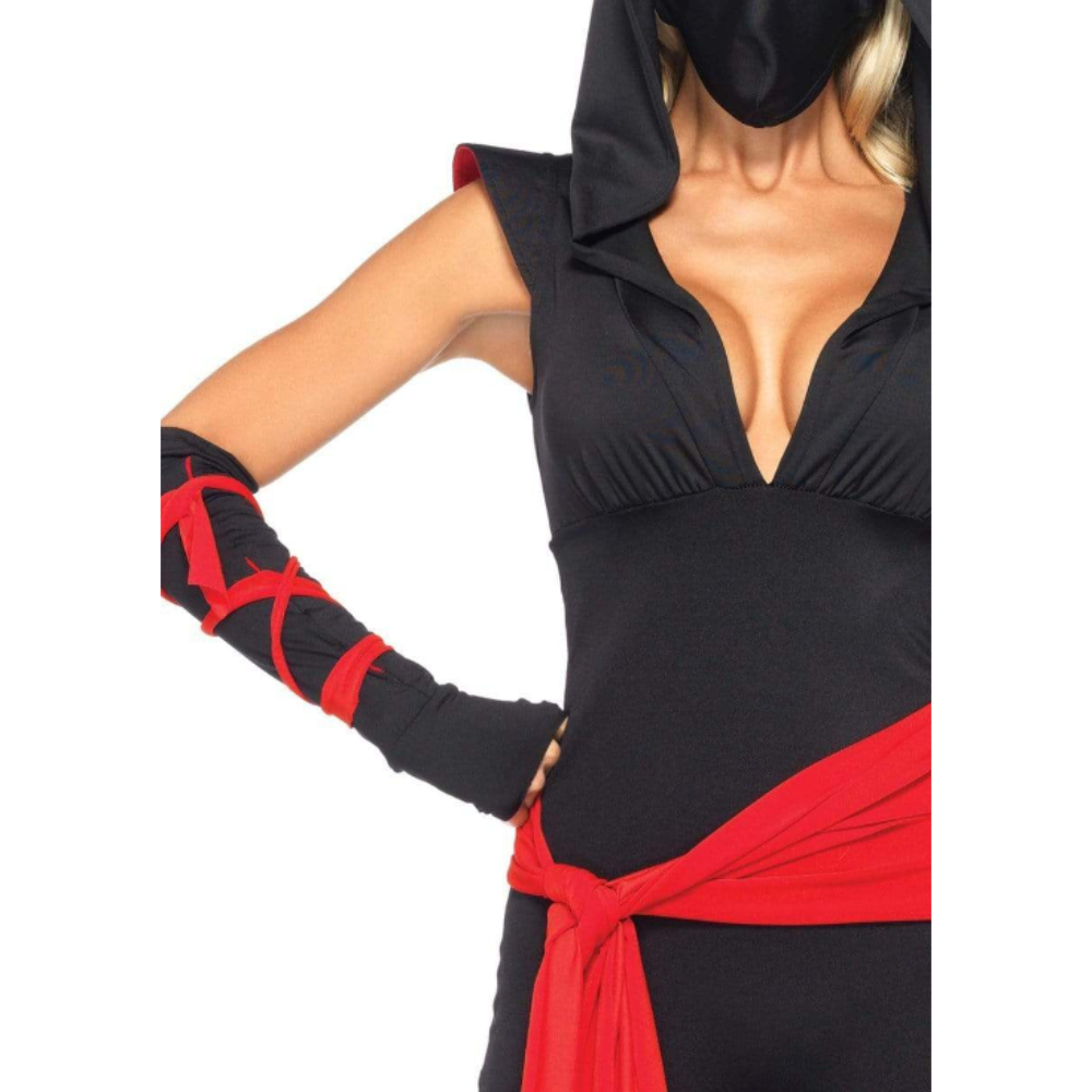 Stand out while lurking in the shadows in the 4 PC Deadly Ninja Costume by Leg Avenue. This sexy Halloween costume includes a hooded deep-V jumpsuit with shoulder guards and attached leg wraps, red waist sash, arm warmers with attached wraps, and ninja face mask.