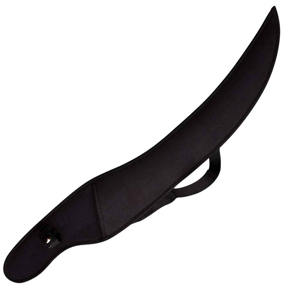 Do you want a sword with some serious fantasy style? If you do, you should make sure to check out the Ringed Hilt Two-Tone Fantasy Sword. Made from stainless steel, this short sword consists of a single piece of metal. It has a curved, double-edged blade. The edges are silver, while the body is black. At the base of the blade, there are concave curves along the sides of the ricasso. It also has three oval cutouts.