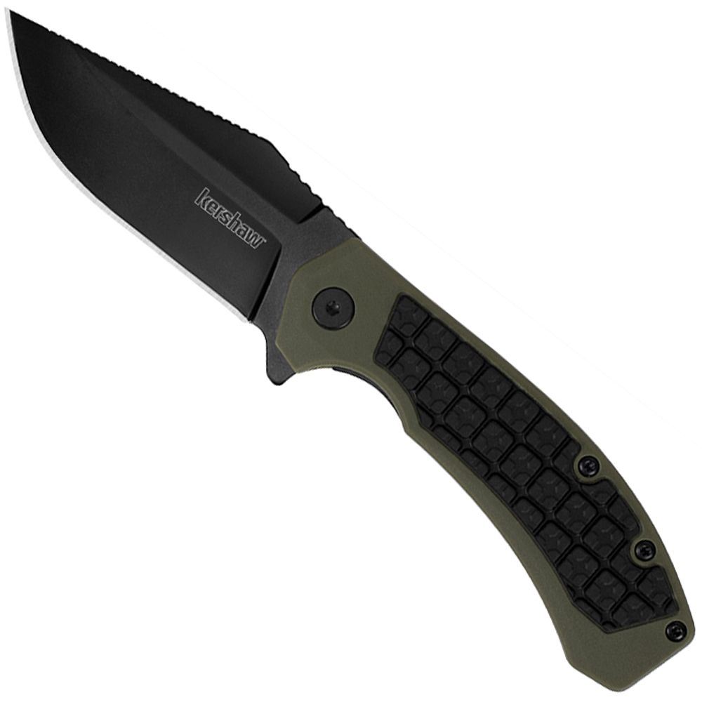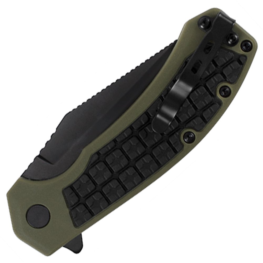 The handle is olive drab glass-filled nylon with a rubberized, super-grippy and textured overmold. Heavy jimping on the blade back adds additional grip. To bring this knife in at an adventure-ready weight, Kershaw adds an inset liner lock, which provides the blade-lockup security of a locking liner with less bulk and at a lighter weight.
