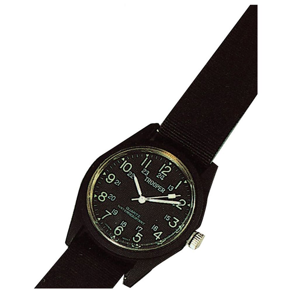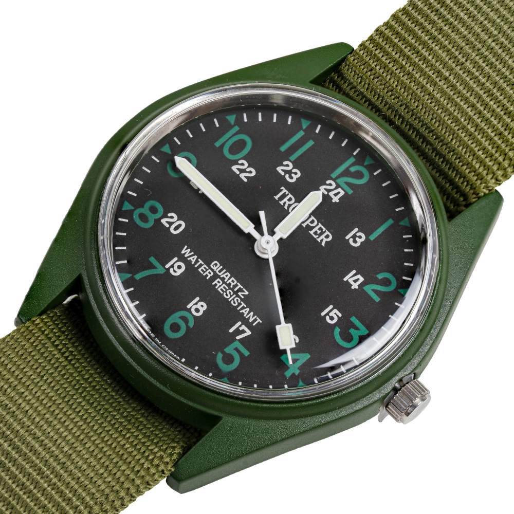 Classic military style field watch features a quartz With Battery , Water Resistant , Stainless Steel Back , Metal Frame