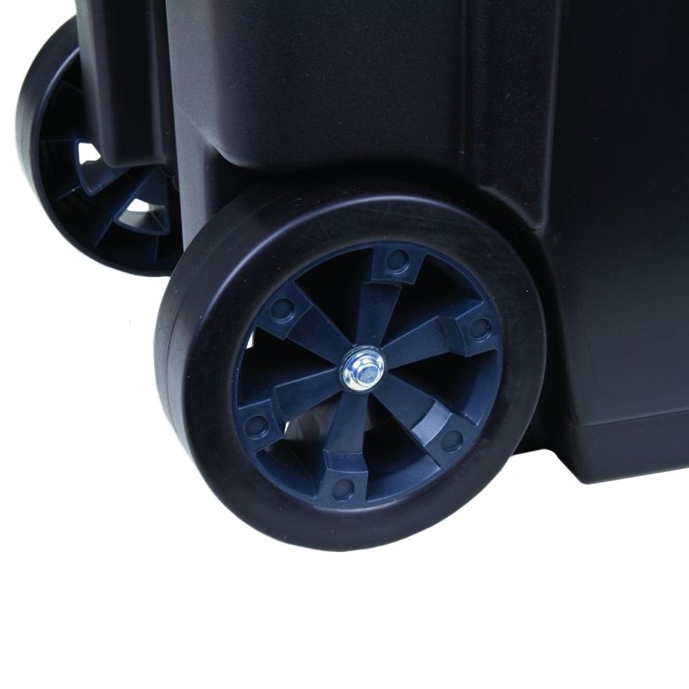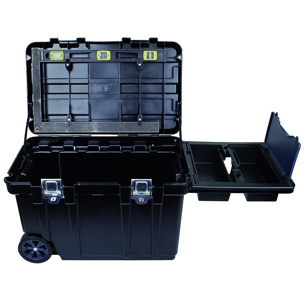 This Flambeau tool cart not only stores your tools, it gets them to the job site and gives you a space to use them! It has a durable high-density polyethylene shell with an inner capacity of 24 gallons. Even when its fully loaded, the retractable padded handle makes it easy to roll this chest around. The lid has slotted grooves to hold 2x4 lumber and the removable tray can be stacked along side for extra work space. Inner compartment measures 27.25" x 13.5" x 17.5".