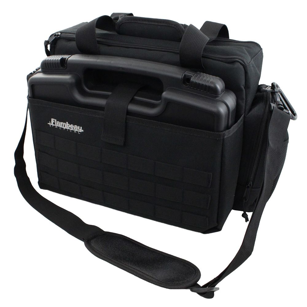 Pistol, ammo, magazines, targets, and tools—pack ‘em all to go with Flambeau Tactical Range Bag! This comprehensive pack has an integrated pistol case sleeve with an included 14-Inch Safe Shot Pistol Case. The bag has a double-zipper main compartment, two side pockets, and a rear pocket panel that unzips into a handy work/cleaning station. Measures 19” x 11” x 11”.