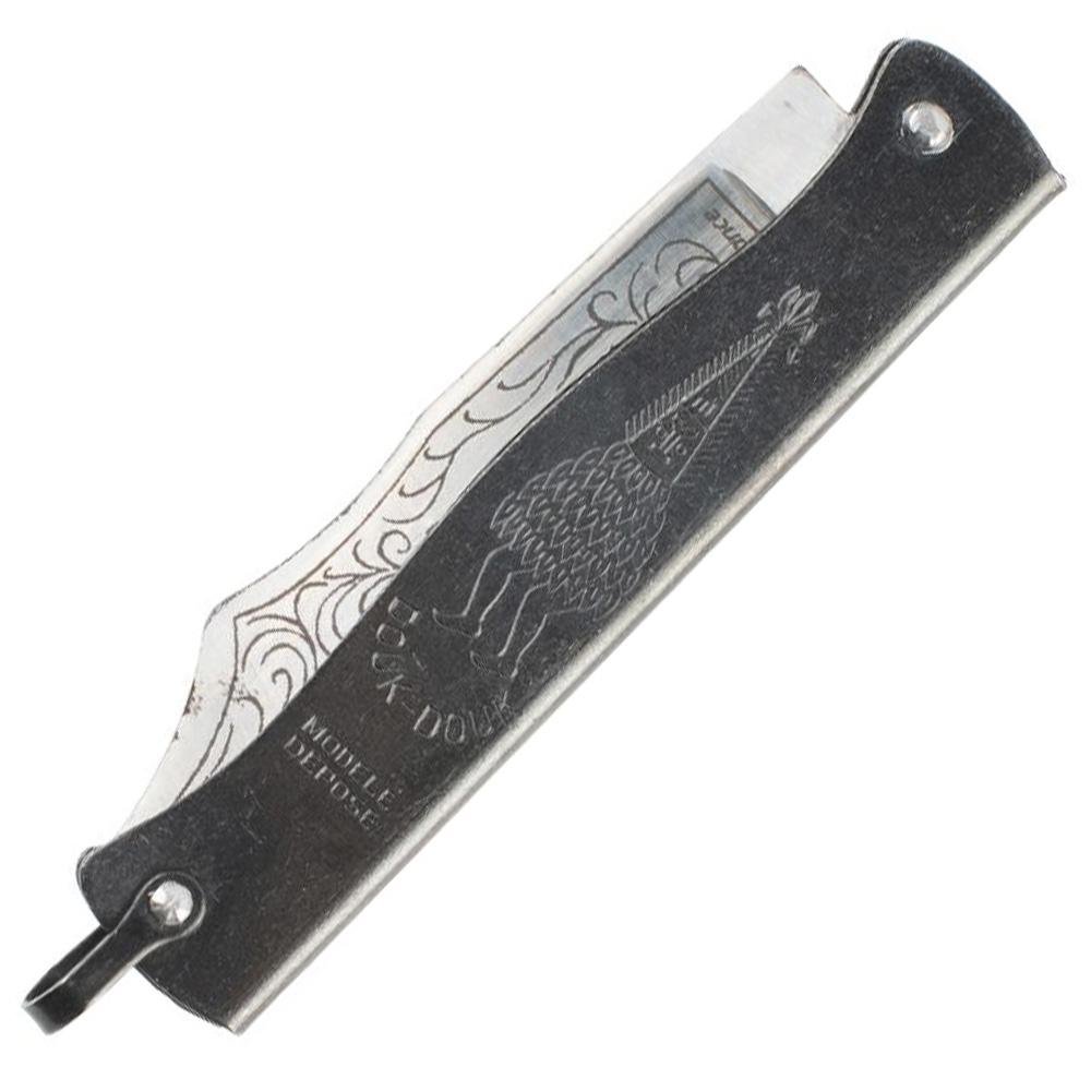 4 3/8" closed. 3 1/8" carbon steel blade with Douk-Douk scroll etching. Ferro-blackened folded steel handles with bail. Front handle is etched with Douk-Douk artwork. Bulk packed. Famous in the former French colonies for over 70 years and used recently for decades by the Army and in the French Foreign Legion, these are tough, working knives. Made in France.