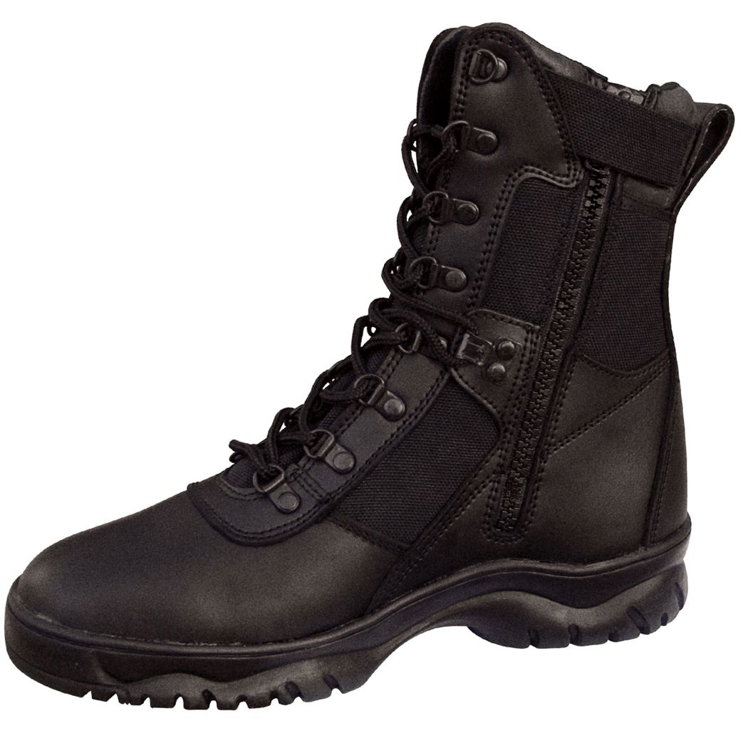 Forced Entry Tactical Boot with a zipper on the side is offered in black color. This pair of boots measures 8 inches and is offered with a variety of attractive features that include pigskin leather collar, action leather upper, full grain leather vamp, slip resistant sole, gusseted tongue with steel shank, moisture wicking lining and hardware speed laces that are rust proof. These boots are offered in sizes ranging from 5 to 15. Black Forced Entry Tactical Boot is ideal to be used on duty, while going hiking and while gearing up for combat. This footwear for men is made of finest materials and offers enhanced performance and long lasting comfort.