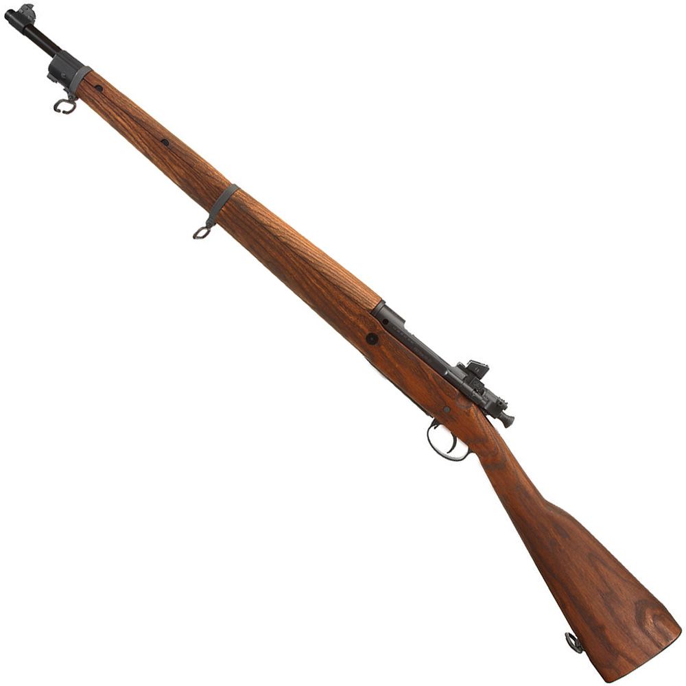 The G&G GM1903 A3 Airsoft Gun is a solid replica of the famous Springfield 1903A3, featuring a real wood and full metal construction. The bolt action system is smooth to cycle and the gun fires beautifully. Two front and a single rear sling point allow you to make use of a two point sling system as issued duringn WW2. The bolt is also removable for easy cleaning. A hidden hop up adjustment knob allows you to adjust the BB's flight trajectory without sacrificing realism. For added realism, G&G engraved unique serial numbering on the receiver and included a functional safety mechanism forward of the firing pin. This model is powered by a green gas 9rd metal magazine.