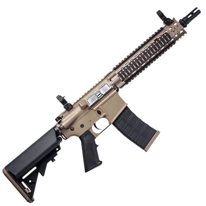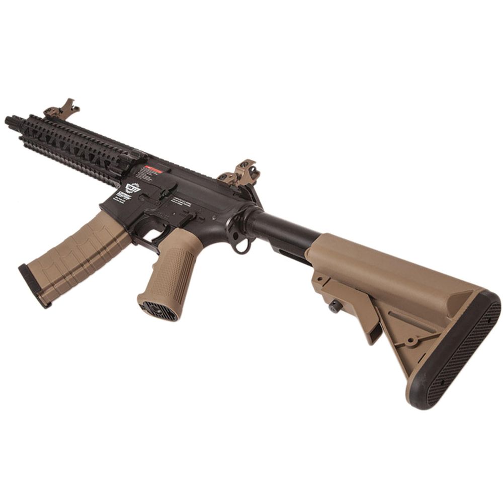 Stand out from the crowd with this two-tone black and tan AEG from G&G’s Combat Machine Line. The CM18 MOD1 features a light-weight polymer frame and custom designed furniture, including a quad rail handguard with four rail ladder covers. The rifle comes with a colour-matching 120-round magazine with an integrated post that ensures even BB feeding in both semi-auto and full-auto firing mode.