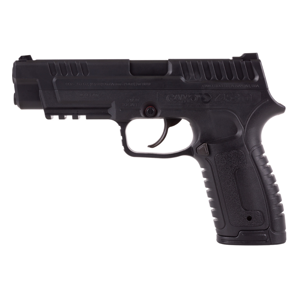 The P-430 CO2 powered air pistol shoots both .177 caliber pellets and BBs at 495 feet per second. This pistol comes with a pellet clip that holds 16 rounds (each end of the magazine features a rotary clip holding eight pellets each). The P-430 features a textured grip and a tactical rail underneath the barrel that allows mounting accessories like lasers or lights. It also features semi-auto action and fixed sights. CAUTION: Only use standard-skirt pellets with Gamo CO2 pistols. To avoid damaging your magazine, never use long-skirt pellets, such as Red Fire, Blue Flame, Glow Fire, PBA Bullet, Magnum, Master Point, Armor, Lethal, Rocket or TS-10.