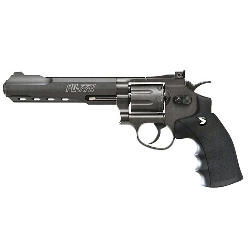 This 8-shot pellet repeater has a real revolver mechanism, and single and double action. Powered by a CO2 cartridge, the Gamo PR-776 has a 6" rifled steel barrel. The molded, stippled grips have finger grooves for added control. Extremely realistic.