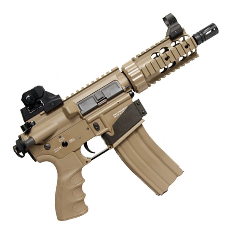 The G&G Full Metal TR16 CRW Blow Back AEG is an innovative new M4 pistol-style AEG from G&G. It features a full metal construction that gives it a nice, realistic weight, as well as a compact metal RIS unit that is perfect for the addition of your favorite accessories. What sets the TR16 CRW apart from many other M4 pistol AEG's on the market today is it's battery compartment design. Whereas many of these have to use a PEQ-style battery box that takes up rail space, the TR16 CRW utilizes a magazine-shaped battery compartment that looks like a ready-mag system. This not only allows you to utilize all of your rail space, but it adds an extra tactical look to the overall appearance.