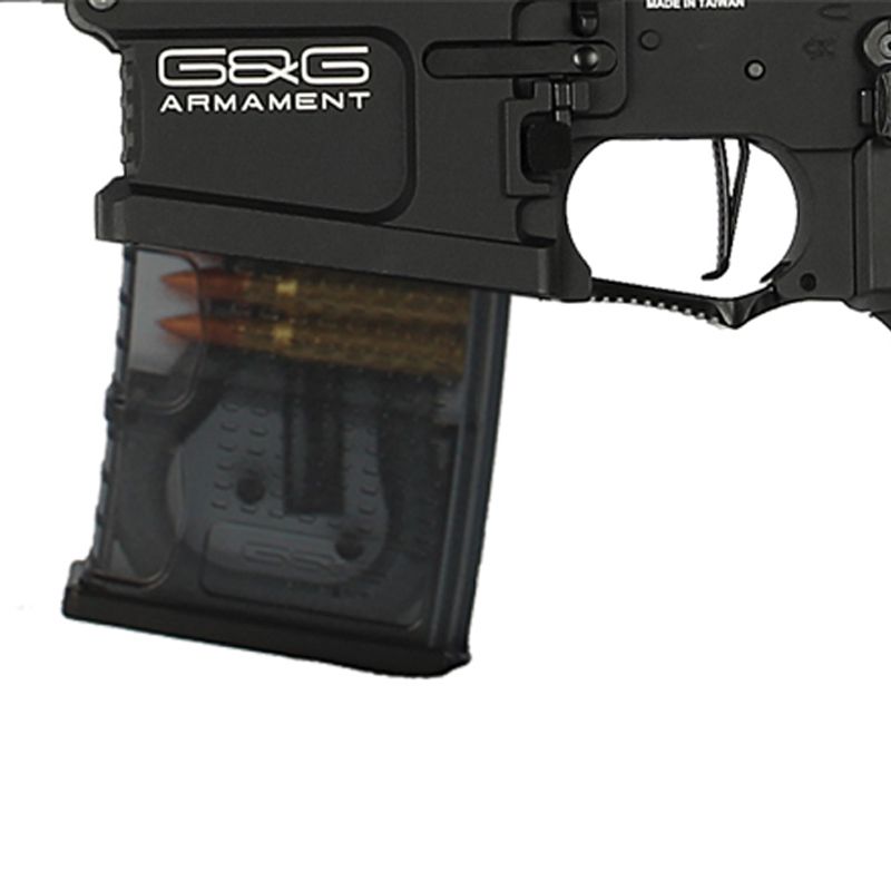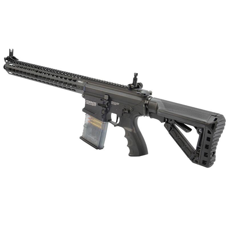 G&G prides itself on producing high-performance airsoft guns with long-range accuracy, and creating extremely accurate replicas of models held in high regard by military and law enforcement agencies. The G&G TR16 MBR 308SR 40 ROUNDS AIRSOFT RIFLE is the newest AEG in their extensive arsenal and is no exception when it comes to top-of-the-line quality, built with next-level internals and top-notch externals. The 308SR rifle is the perfect choice for those looking for a high-grade CQB weapon or long-range rifle. Utilize the seemingly endless four-sided MLOK rail, offering more than 40” inches of rail space, to accessorize the TR16 308SR with a wide variety of optic options, or attach a tactical flashlight, laser, or vertical grip to the bottom MLOK rail underneath the handguard. The full metal upper and lower receivers and functioning bolt catch add a level of realism to this G&G rifle. The ambidextrous magazine release and fire selector ensure any player, despite being left or right-handed, can operate this rifle with no limitations. The multi-position adjustable Crane stock allows for easy alteration of overall length for players of all sizes to operate this rifle comfortably and makes it quick and easy to adapt from CQB to long-range engagements. The flip-up High Visibility front and rear iron sights are perfect for zeroing in your targets on the spot or can be flipped down to make room for your choice of optic accessory. The full metal G2 Gearbox features an upgraded torque motor for peak performance, and 8mm bearing & bushing combination to ensure smooth and reliable gear change and requires less maintenance due to heavily decreased levels of wear and tear. The gearbox also comes outfitted with a programmable MOSFET unit to program the trigger to 3 or 5-round burst and features a Low Battery warning to let you know when it's time to switch out batteries so you're not stuck on the battlefield with a dead rifle. This rifle is also outfitted with low-resistance wiring to protect trigger contacts and reduce shortages and power loss. The integrated Quick Spring Change System allows the player to quickly and easily modify or adjust the power level and rate of fire by upgrading the spring. By combining a rugged metal build with the power and accuracy needed to out-gun the competition, G&G has created an AEG that will surely resonate with players of all skill levels and play styles.