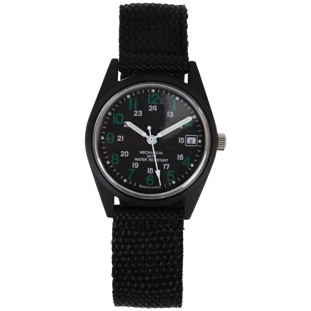 GI type Vietnam Era Wind-Up watch works with mechanical movement. The strap is made of good quality nylon material which makes it strong, sturdy and extremely durable. The metal case gives the watch an attractive and smart look. The strap color matches well with the metal case. The watch no doubt is trendy and suits young generation. It is made to GI government issued style. The wind-up mechanism is rare to see in this modern technology world. The numbers in green color with bright white color hands makes it easy to see the time. There is small box provision for calendar. The watch comes in metal gift tin.