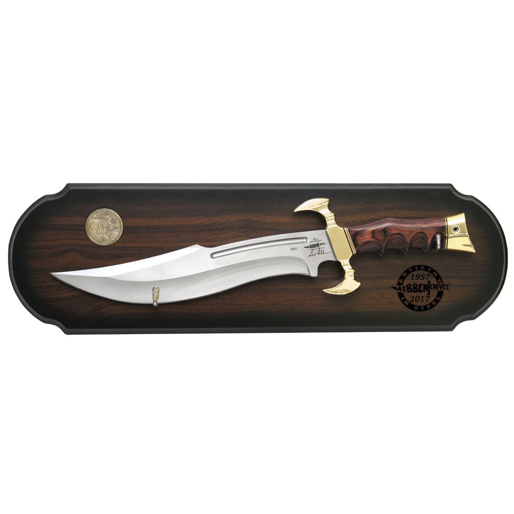 Artist extraordinaire, Gil Hibben, celebrates the 60th anniversary of Hibben Knives with his Hibben Legend Bowie Knife. Only a limited number of these collectible bowie knives will be produced so don’t wait! This is a massive statement knife with its 12” 3Cr13 stainless steel blade and gold cast metal alloy guard and pommel. The handle is of beautiful pakkawood and has finger grooves for a comfortable grip when you hold it in your hand. You can proudly display the Hibben Legend on the premium wooden display plaque that features a beautifully rendered 3D, full portrait of Gil Hibben on a shield inset in the plaque. This is a must-have addition to your Gil Hibben knife collection!