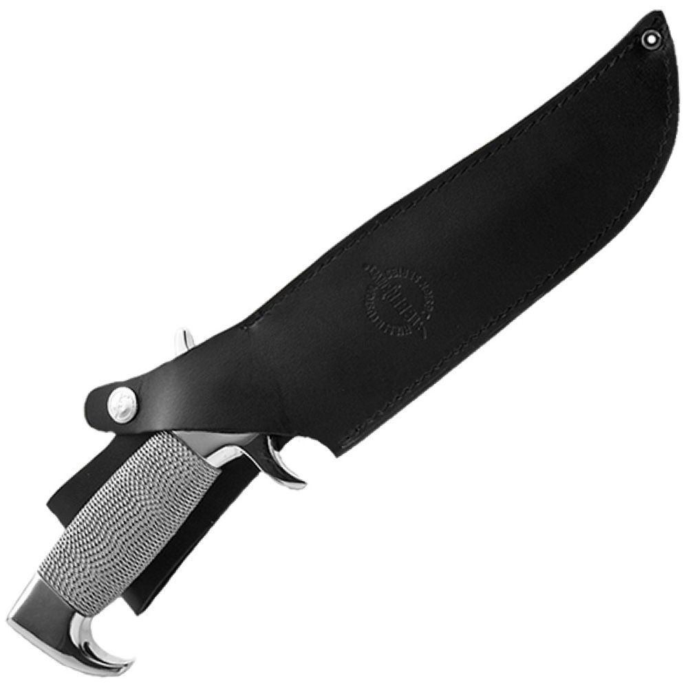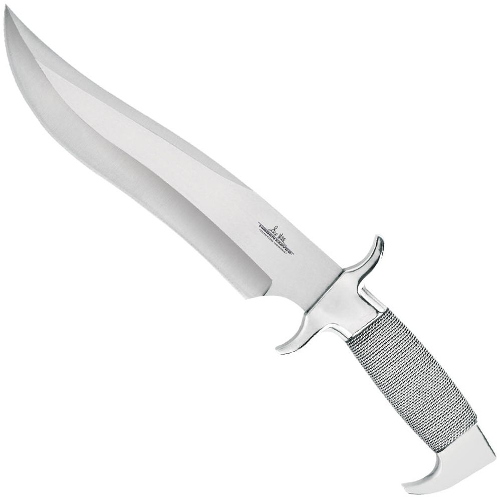 This classic stainless masterpiece was designed with the ancient highlanders in mind. The 8 3/4" 420 stainless steel blade features a mirror-polished stainless guard and pommel with a stainless-wire-wrapped handle for a sleek grip. Includes a leather snap closure belt sheath. 13 1/2" overall. 8 3/4" blade.