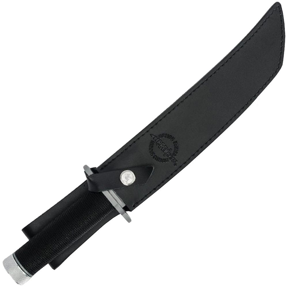 The latest masterpiece in Gil Hibben’s legendary custom-designed knife lineup is this show-stopping Hibben Sawback Survival Tanto. Featuring a razor-sharp 7Cr17 stainless steel beast of a blade with a bead-blasted finish, this powerful tanto is stout! It offers a double-serrated sawback design with an oversized guard and cord wrapped handle. Unscrew the end cap to find a built-in compass. Includes embossed leather sheath.