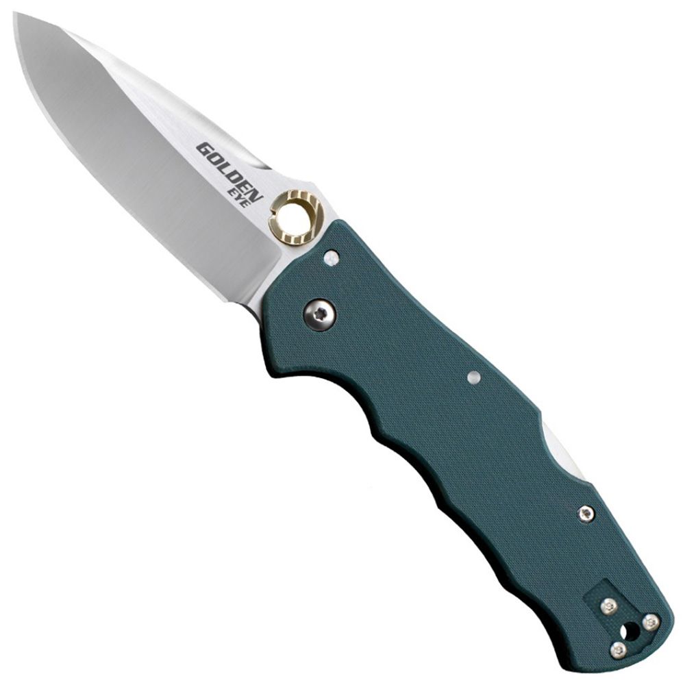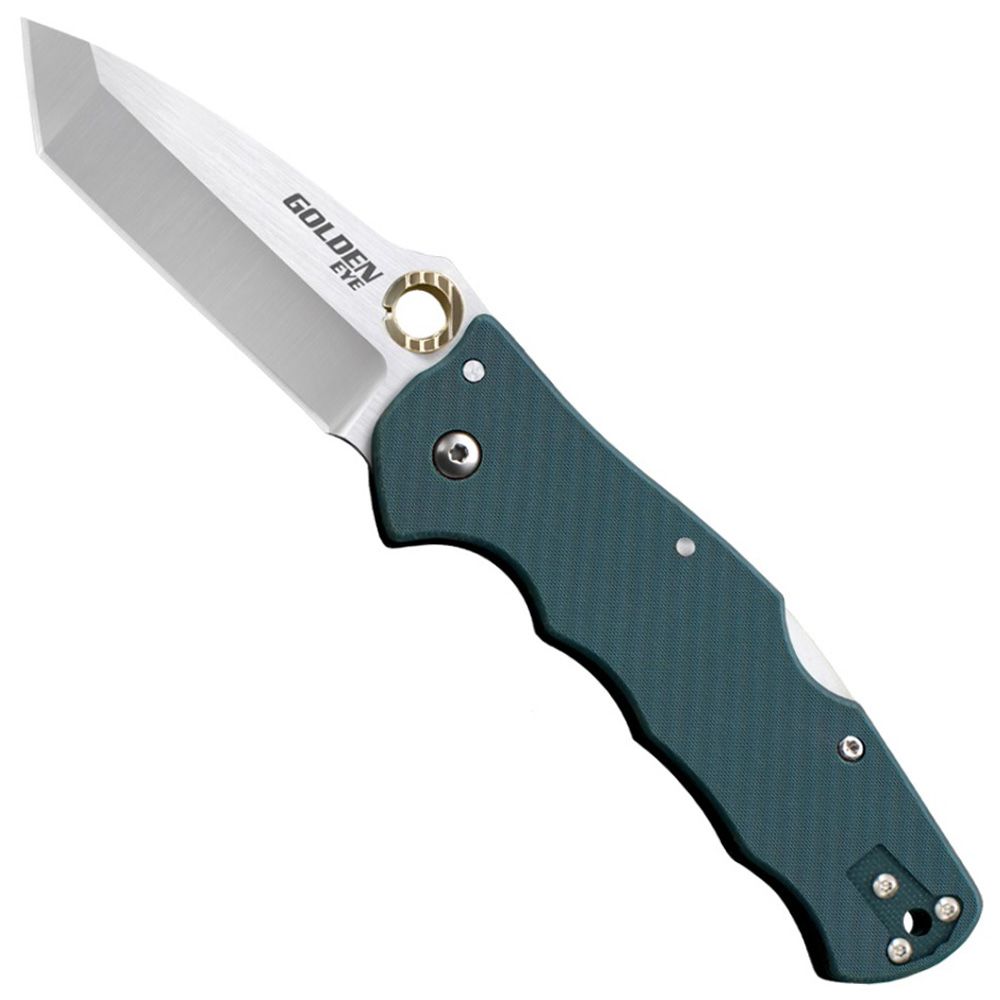 The Cold Steel Golden Eye is a new addition to our latest range of performance “EDC” (every day carry) blades. Designed by award-winning custom knife maker Andrew Demko, this eye-catching new pocket knife is thin and light enough to carry all day with comfort and ease, with the elegant good looks you want from a high-end production folder. The Golden Eye’s hand-honed razor sharp blades are available with either the iconic Cold Steel American Tanto point or Andrew Demko’s signature modified Drop point. Both are line grain two-tone satin polished - a costly and time consuming process usually seen on expensive custom knives - making their exquisite grind lines really gleam as the blade catches the light. The contrasting brass HTR thumb ramp allows for smooth and easy ambidextrous deployment, while adding another element of visual appeal to an already eye-catching blade. The Golden Eye’s ergonomic medium textured G-10 handle scales give an extremely secure and comfortable grip, while their rich forest green beautifully compliments the steel and brass colors of the blade. An extra-long, slimline steel clip (with integrated lanyard hole) allows for comfortable and discreet ambidextrous tip-up carry, while keeping the Golden Eye snugly secure in your pocket. Lastly, we have equipped the Golden Eye with our Tri-Ad locking mechanism, giving unparalleled security, safety and strength.