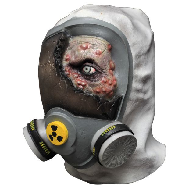 Spread infectious diseases this Halloween in the Hazmat Zombie Halloween Mask. This toxic zombie is wearing a white hazmat suit with a shattered biohazard helmet. A single blue eye peers out, surrounded by red pustules. Whatever he has, it must be fatal. This latex costume mask is a great choice for zombie walks and haunted houses.