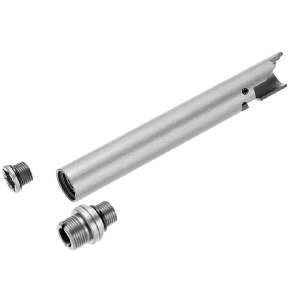 This non-recoiling outer barrel creates a stable firing platform, reducing all movement between the outer barrel and slide, in other words a "fixed" outer barrel, to enhance your Hi Capa overall performance. It will provide you with two interchangeable caps to choose from and is negatively threaded so you can easily fit in compatible suppressors or silencers.