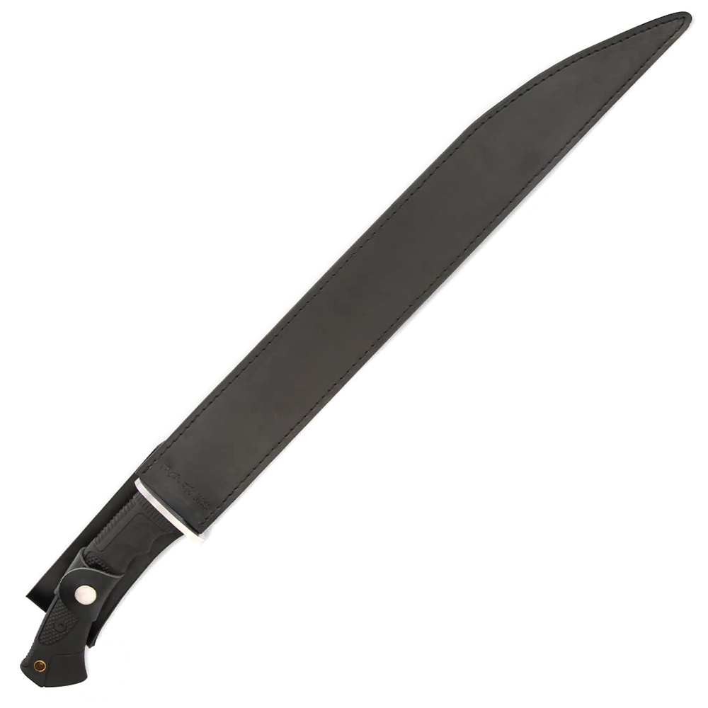 Part of the Honshu line, the Seax knife comes with the same traditional ideals yet lighter, stronger and much more functional. This one is built with a long sleek 7CR13 stainless steel fixed blade with fuller & weight-reducing thru-holes that beautifully contrast the black injection-molded textured TPR handle, giving you a knife with maximum durability and more effectiveness. When not in use, the sword securely snaps into the leather sheath that comes with it and is very easy to carry.