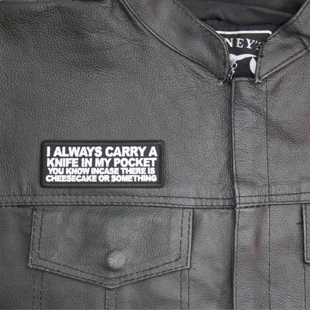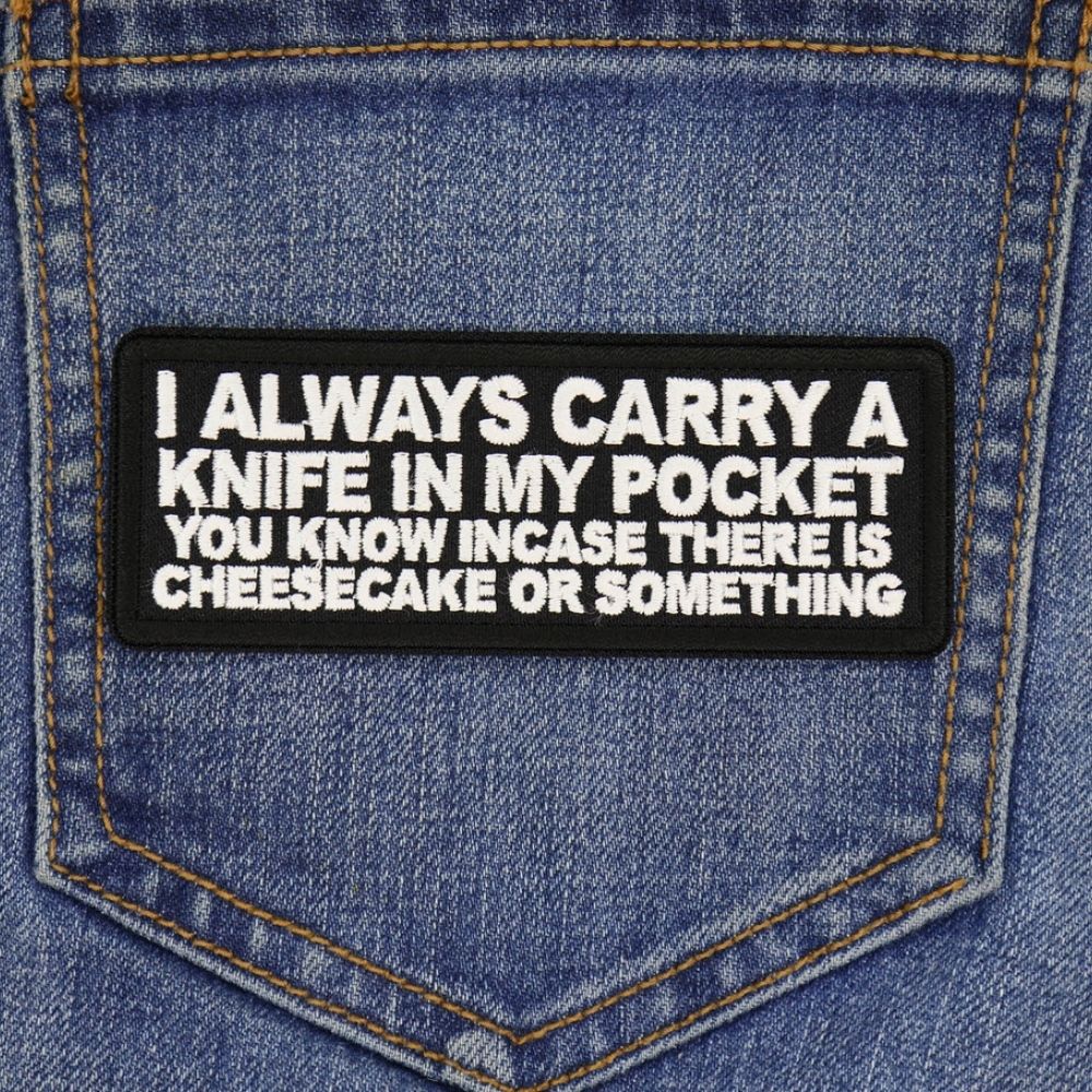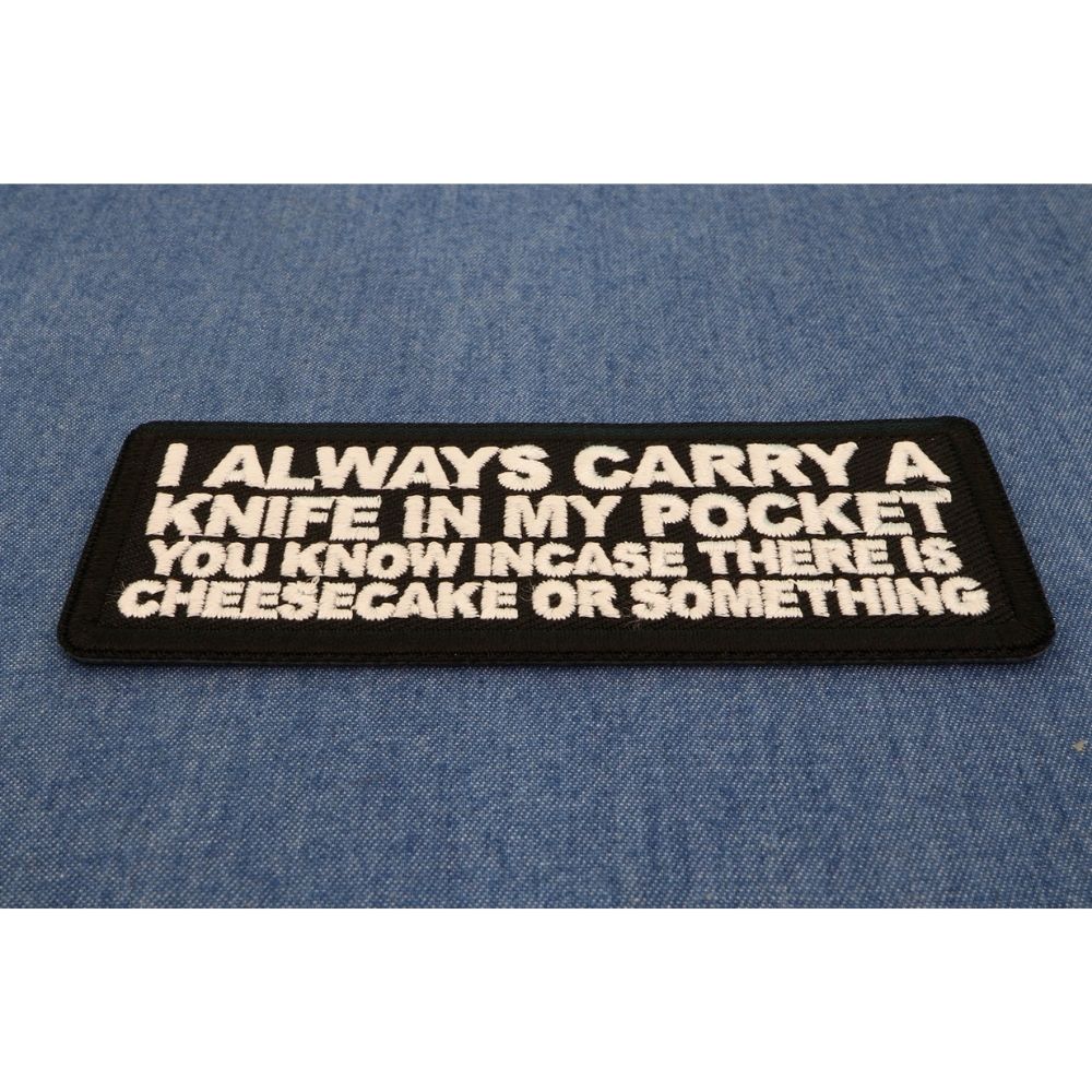 Make A Statement With The I Always Carry A Knife In My Pocket You Know In Case There Is Cheesecake Or Something Patch! This Whimsical 4x1.5 Inch Patch Is Embroidered In Bold Black And White, Perfect For Bikers And Food Lovers Alike. Easily Attach It To Jackets, Vests, Or Even Denim, Using The Plastic Iron On Backing Or By Sewing For Added Durability. For A Permanent Hold, Use A Heat Press At 270-290 Degrees Fahrenheit. Don’t Miss Out On This Fun Patch That Captures Your Personality - Grab Yours Now!
