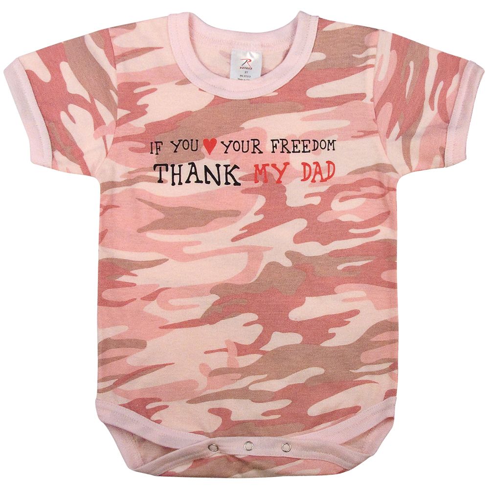Infant Baby Pink Camouflage OThank My Dado One Piece Bodysuit is a smart looking bodysuit designed for your little one. It is made from 100% cotton. It features a snap bottom that allows you to dress the little one easily. It sports a baby pink camouflage print with words if you love your freedom, thank my dad. It is available in different sizes. It is short-sleeved and has a round neck. Its sports a baby pink lining on the neck, sleeves and on the snap-bottom. It also sports a white label on the inner side of the neck. Your little one will definitely look a million dollars in it.