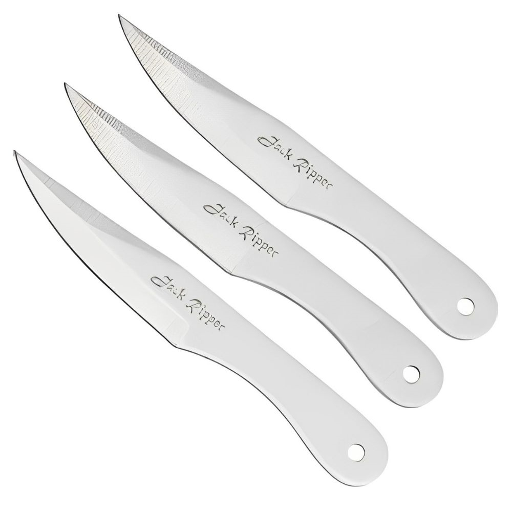 Prepare yourself against encroaching threats with the Jack Ripper Throwing Knife - Set of 3, each measuring a formidable 5.5 inches in length. Crafted from resilient stainless steel, these knives boast a sleek silver finish and feature a sharp clip point tip designed for precise strikes. Adorning the blade is the distinctive "JACK RIPPER" inscription, enhancing their menacing appeal. The curved handles provide a comfortable and ergonomic grip, ensuring optimal control during every throw. For added versatility and convenience, each handle includes a strategically placed hole for easy handling and storage options. Safely housed in a durable black nylon sheath, the Jack Ripper Throwing Knives are ideal for collectors and enthusiasts alike, offering both style and functionality in one striking package.