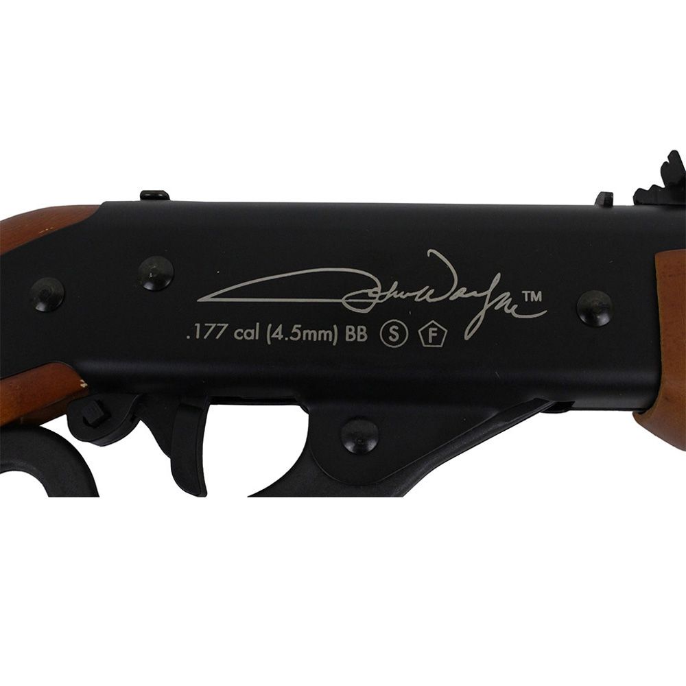 Dispense western justice with the Lil Duke BB Repeater! This lever action rifle is spring powered and fires from a massive 550-round reservoir. In honour of the late great western hero John Wayne the wood stock and metal frame have been engraved with the Duke’s signature and face. The rear sight is adjustable for elevation and the gun comes with a dovetail rifle mount.