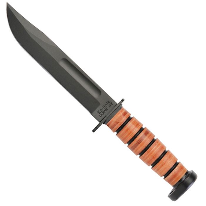 The KA-BAR Dog's Head Utility Knife is a US Marines-inspired camping knife that delivers the versatility of a military knife to strenuous outdoor tasks. The large blade is made of 1095 Cro-Van carbon steel, which ranks high in toughness and edge retention. The handle is weathered leather with an extended butt end for hammering.
