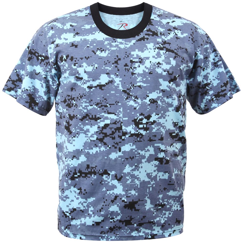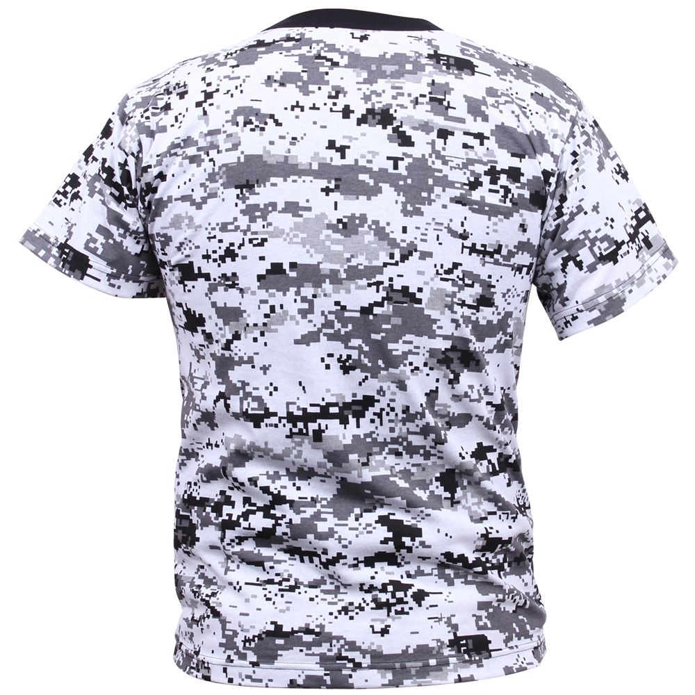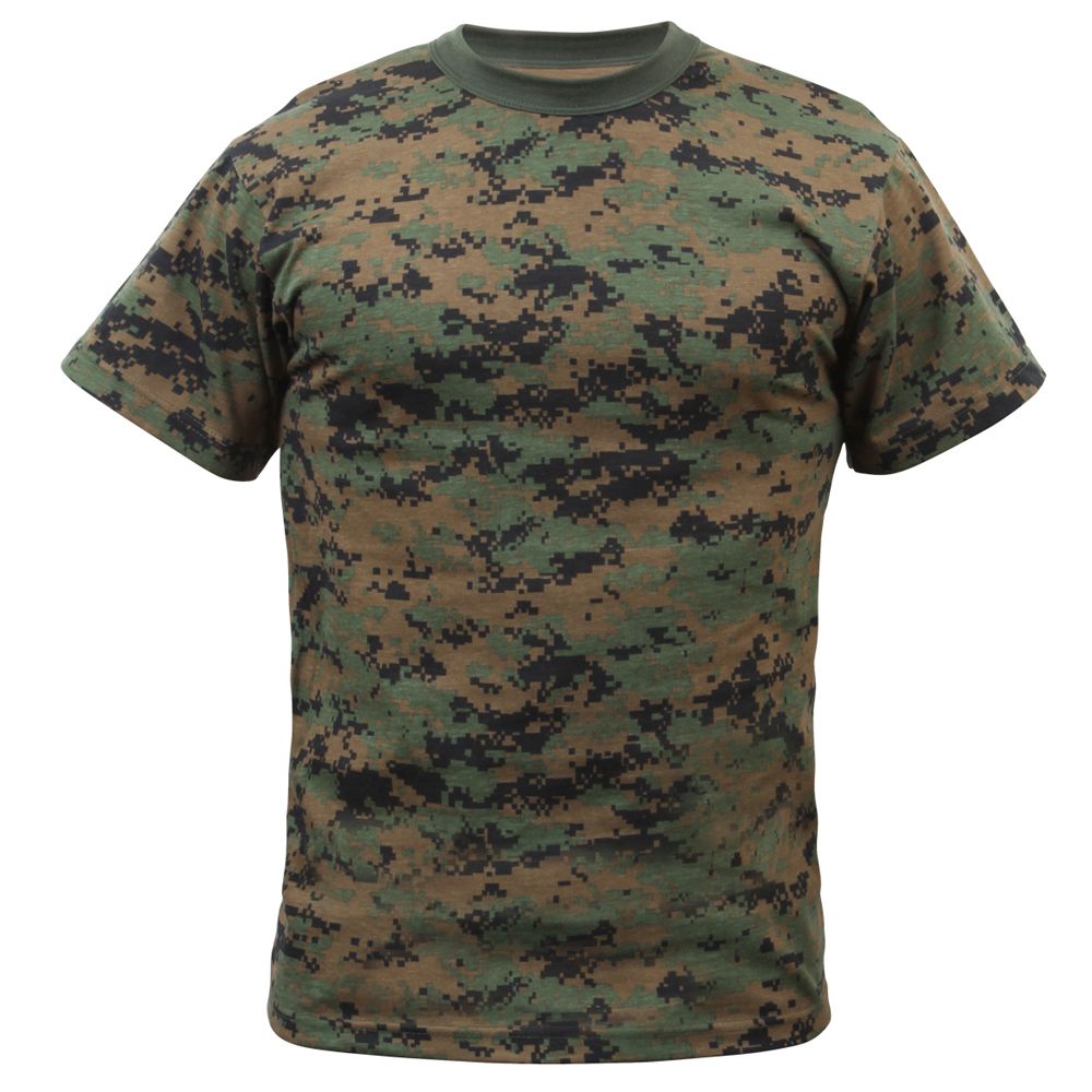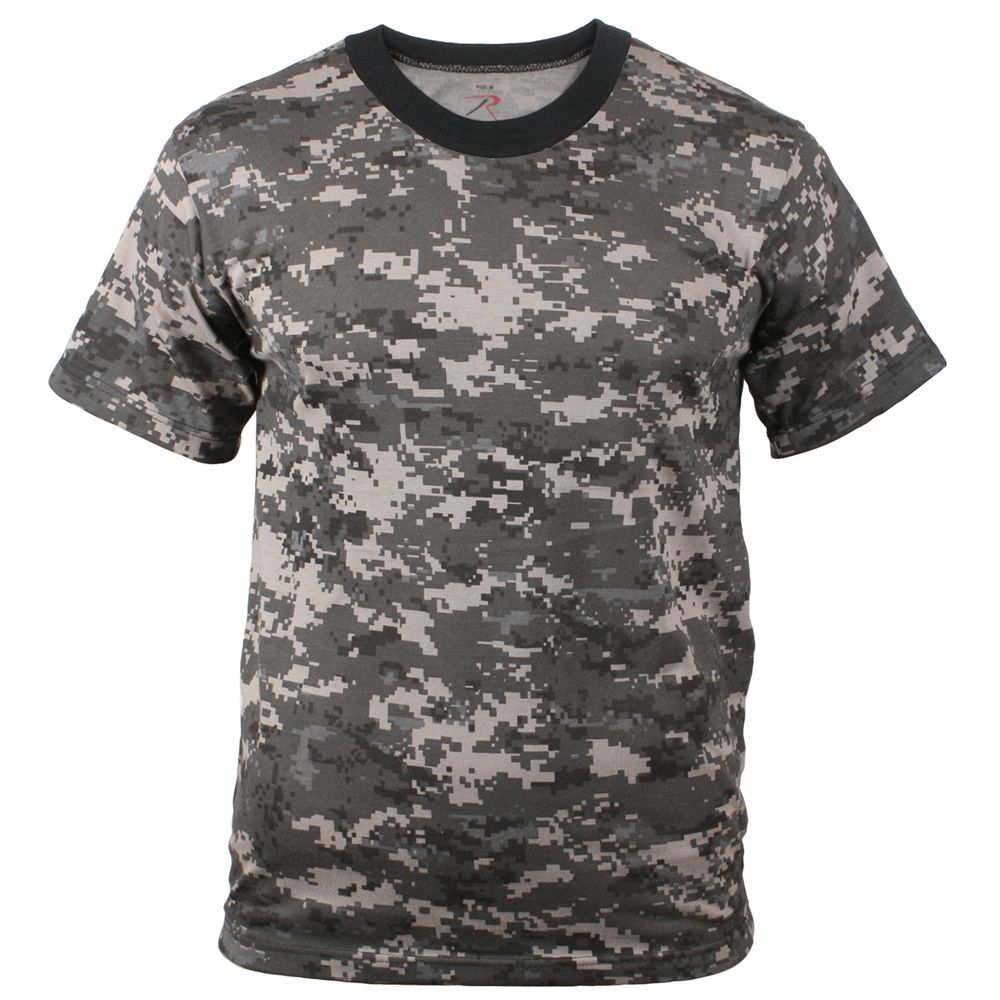 Kids Digital Camo T-Shirt is very smart made from a blend of 40-60% polyester and cotton material. It is extremely stylish and at the same time very comfortable to wear. It comes with short sleeves and is unisex in design. It has brown neck collar and the color combination is such that it can be teamed with any lower. It comes with red and black tag less labels with size above rothco. It also has small white care labels which are sewn inside the side seam.