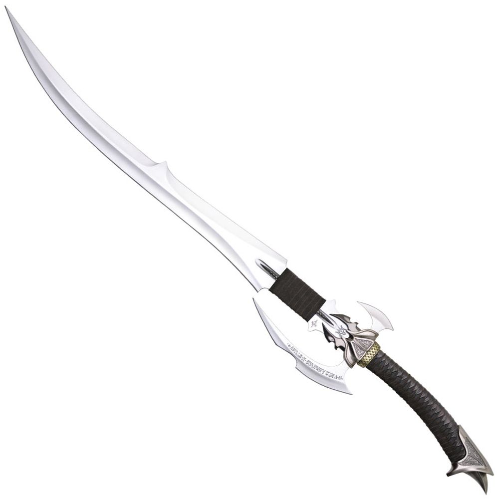The Sword of Enetha, a Mithrodin warrior in service to the Great Realm who fought against the Dark One. Forged by the dark elf Tethietol, the side of the blade is engraved with "Avoloch will yield to none but truth," in Anglecal runes. The word Avoloch is from the ancient language of Thant, and it was the name used for the warrior class of the Mithrodin, translated as "Soldier of Steel." Strictly limited to 1,500 pieces worldwide! Autographed and serial numbered first production run. 420J2 stainless steel blades (false edged). 24.5" blade. 43.75" overall.