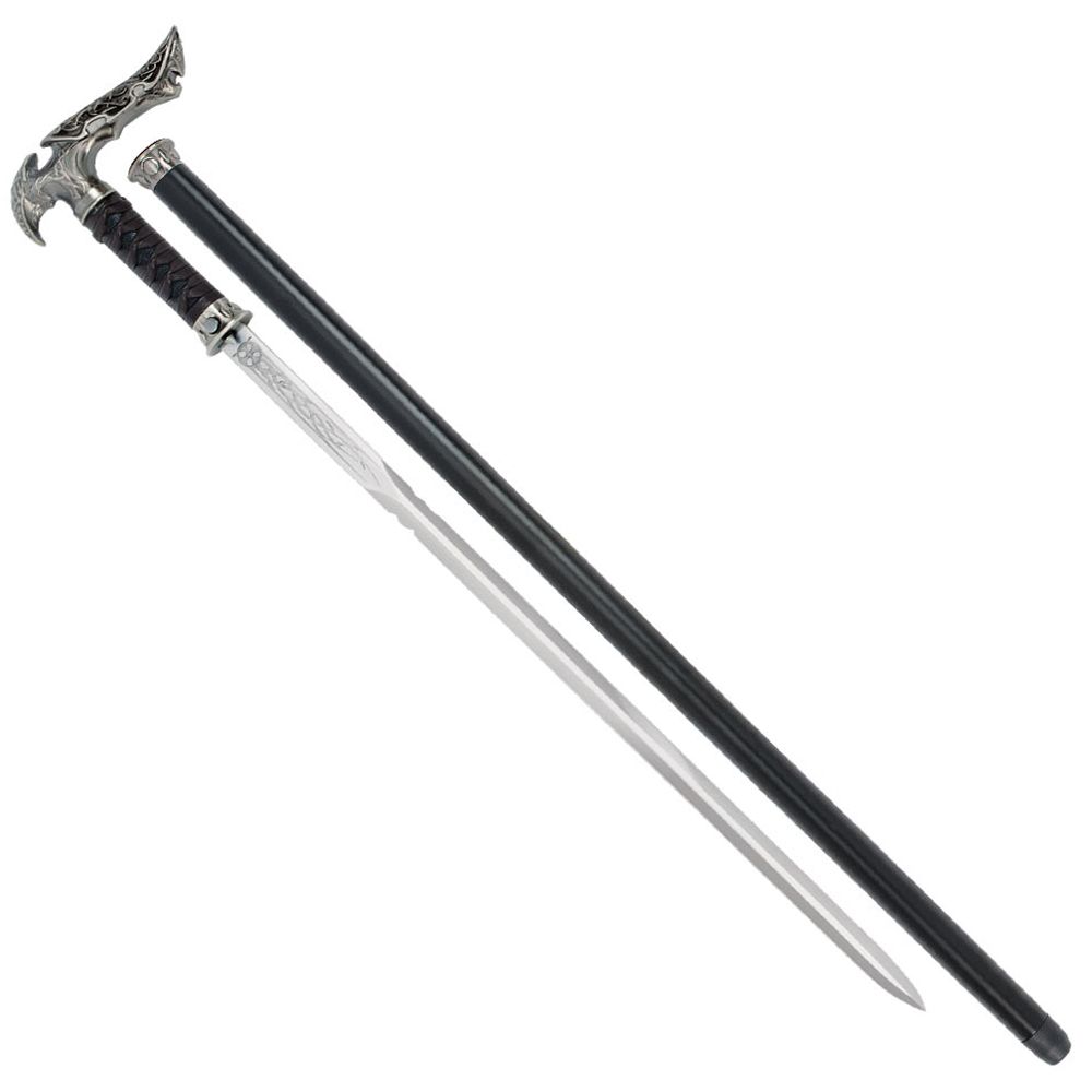 This new sword cane from Kit Rae abounds with scrupulous details throughout its exceptional design. The razor sharp damascus steel blade measures 23” and bears intricate scrollwork etchings. The oversized handle is cast with a heavy metal hilt and fittings, and further accented with ray skin and genuine leather wrappings. The shape and style of the handle offer a sure, confident and comfortable grip. The blade locks securely into the cane shaft, and is accessed with a push of the hidden button that releases the blade locking mechanism. The cane shaft features hardwood construction and is painted black with coordinating accents. Measures 39” overall.
