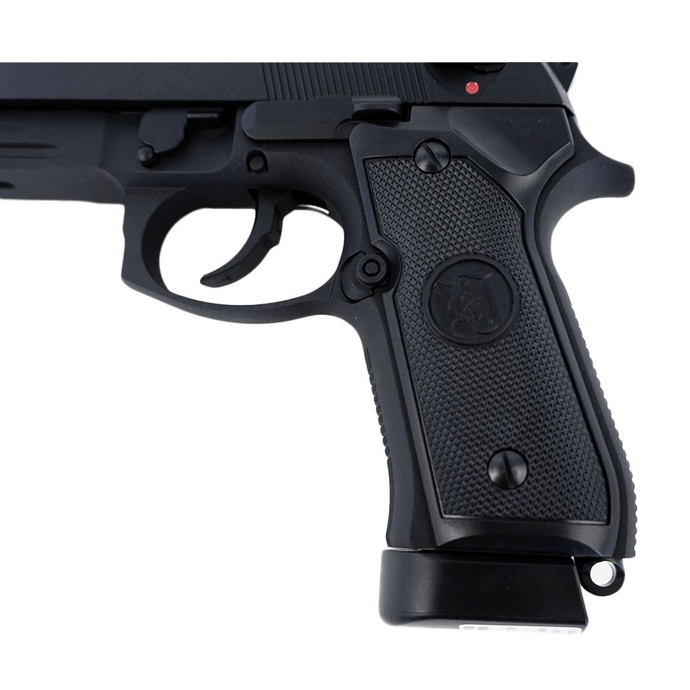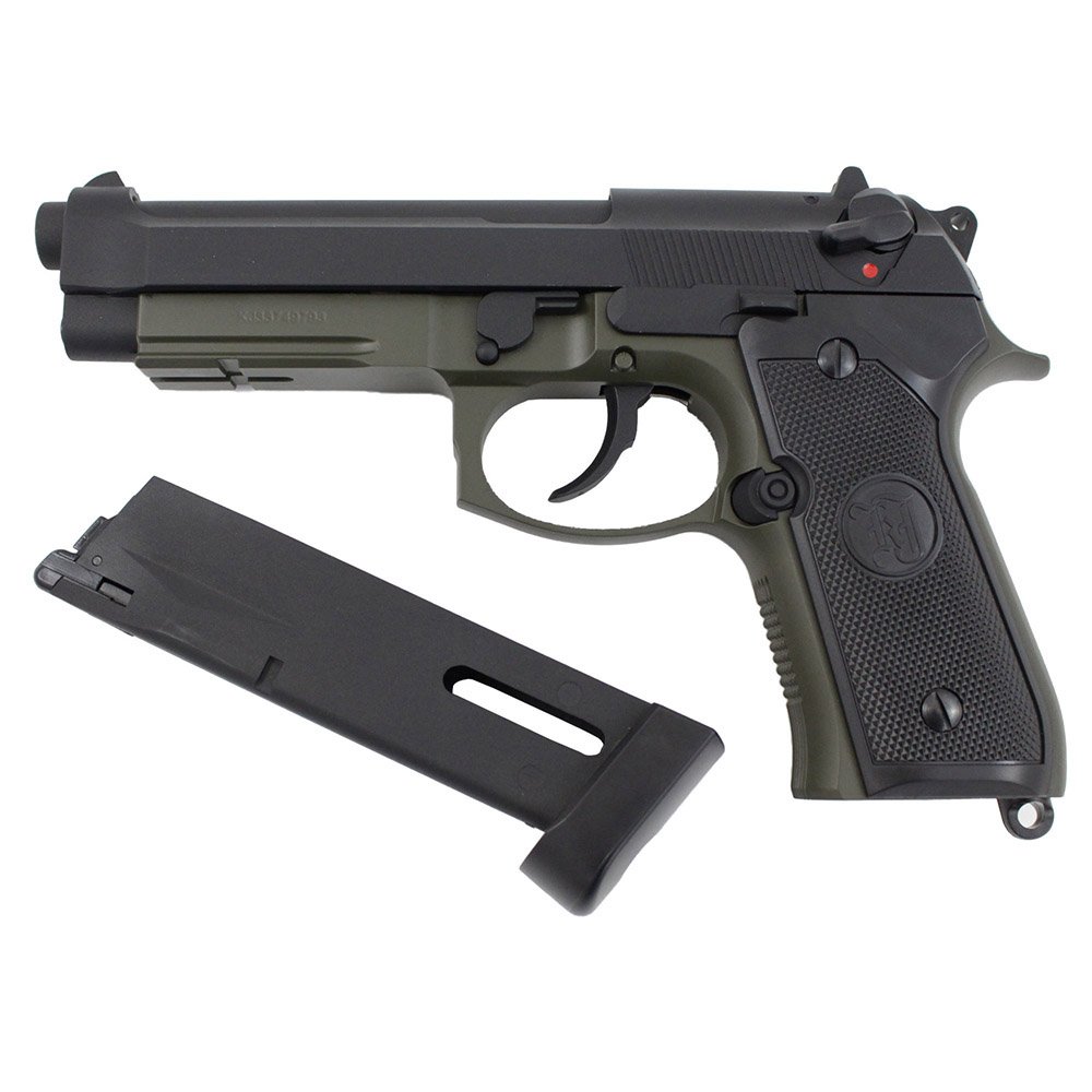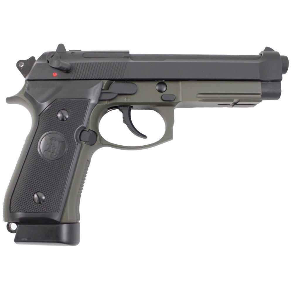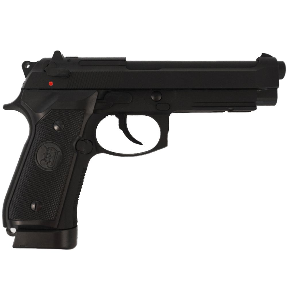 Based off of the legendary Beretta M9, the KJ Works M9A1 CO2 Airsoft Pistol FM Blowback mimics the greatness of its real steel counterpart. The full metal airgun features a solid fit and finish and comes with heavy blowback action, adjustable hop-up, and a muzzle velocity exceeding 370 FPS. The trigger pulls smoothly in both single and double action, just like the original M9A1. Pistol weighs 900g (2 pounds) and holds 25 rounds of 6mm airsoft BBs.