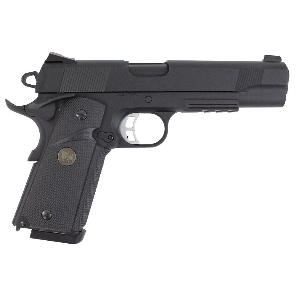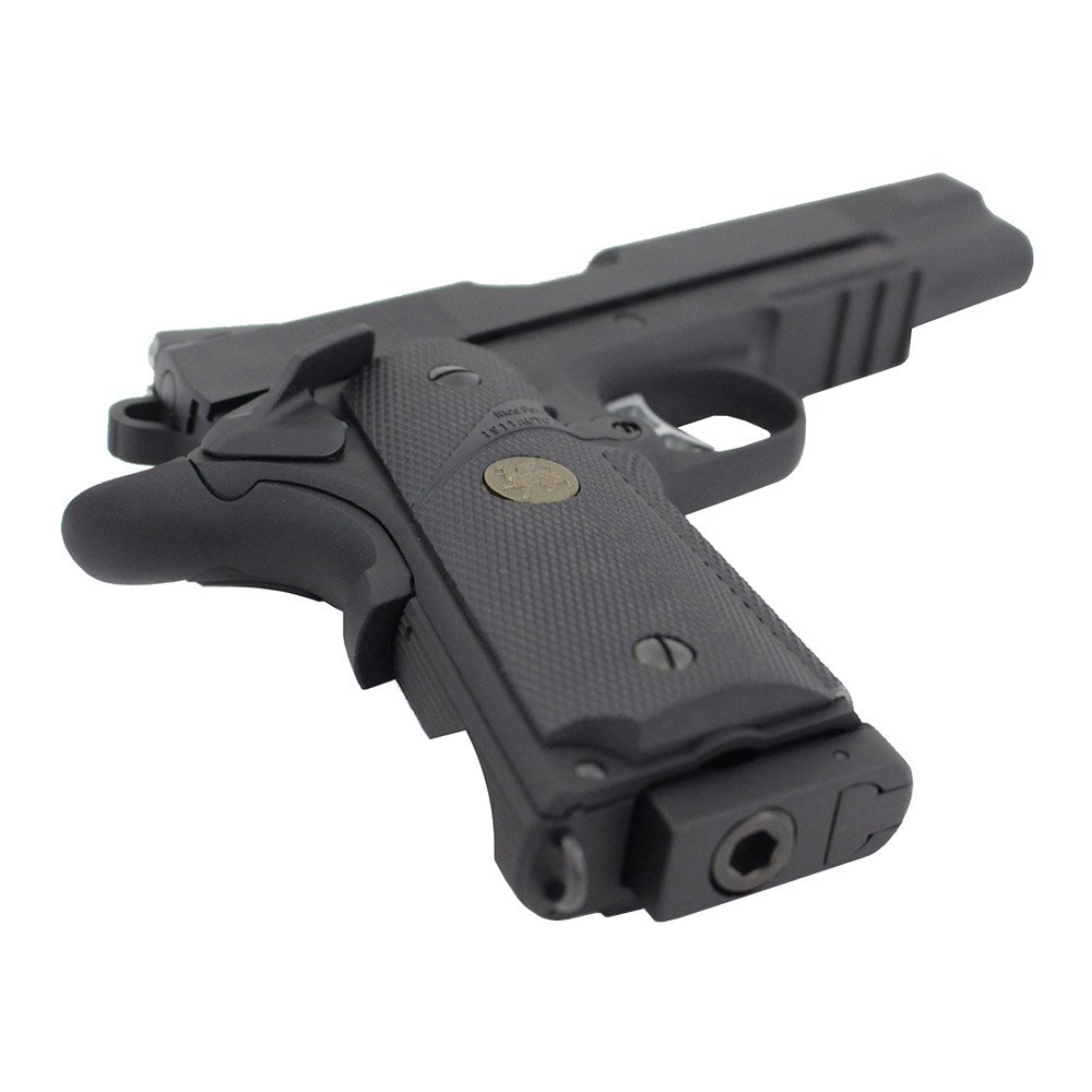 The tactical rail underneath allows for customization with lights or lasers, and the grip safety ensures handling remains secure. A straightforward sidearm for players looking for control, balance, and realism in one platform.