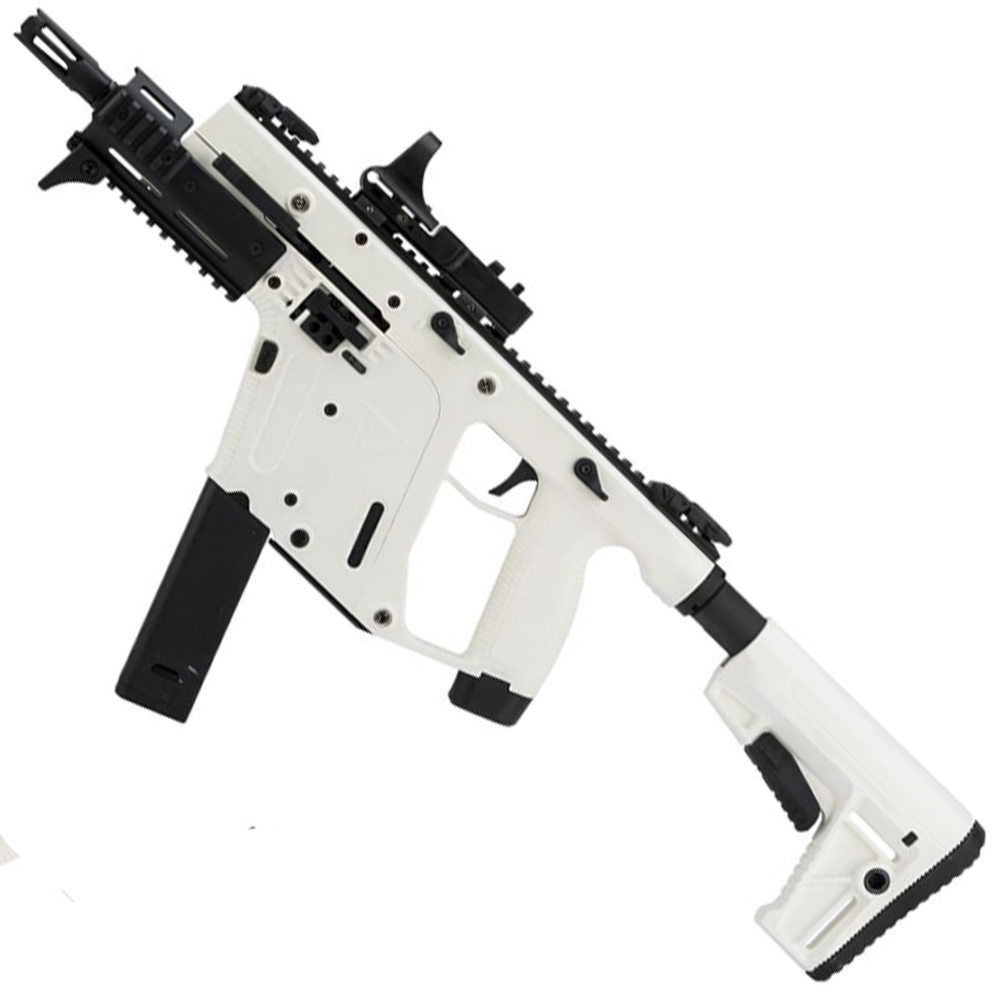 The KRYTAC KRISS Vector AEG "Alpine White" Limited Edition differs from its standard production counterpart by utilizing the KRISS Vector GEN II 2017 one piece upper receiver. Alpine White Gen II Vectors also come equipped with a buffer tube already installed, along with an included retractable stock. Beneath the pistol grip is a new extended battery cover, which adds 14 cm3 to the battery compartment. An MLOK stubby RIS has been installed on the front side of the gun, giving it a bit more versatility and an aggressive overall look.