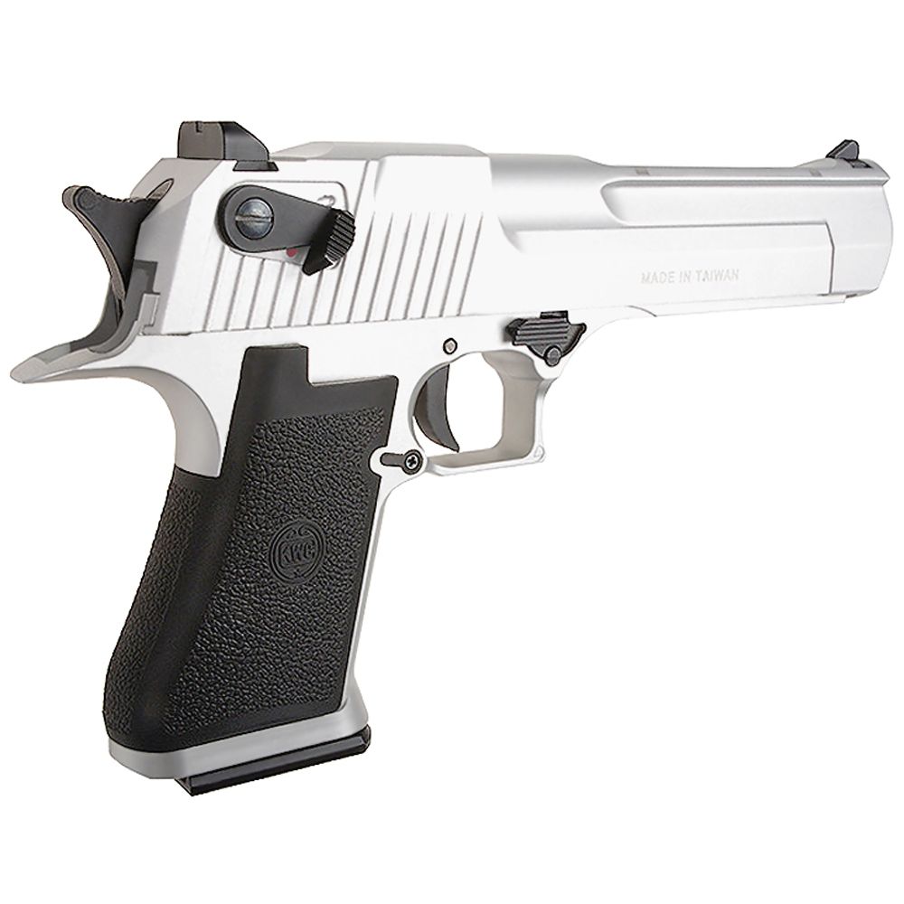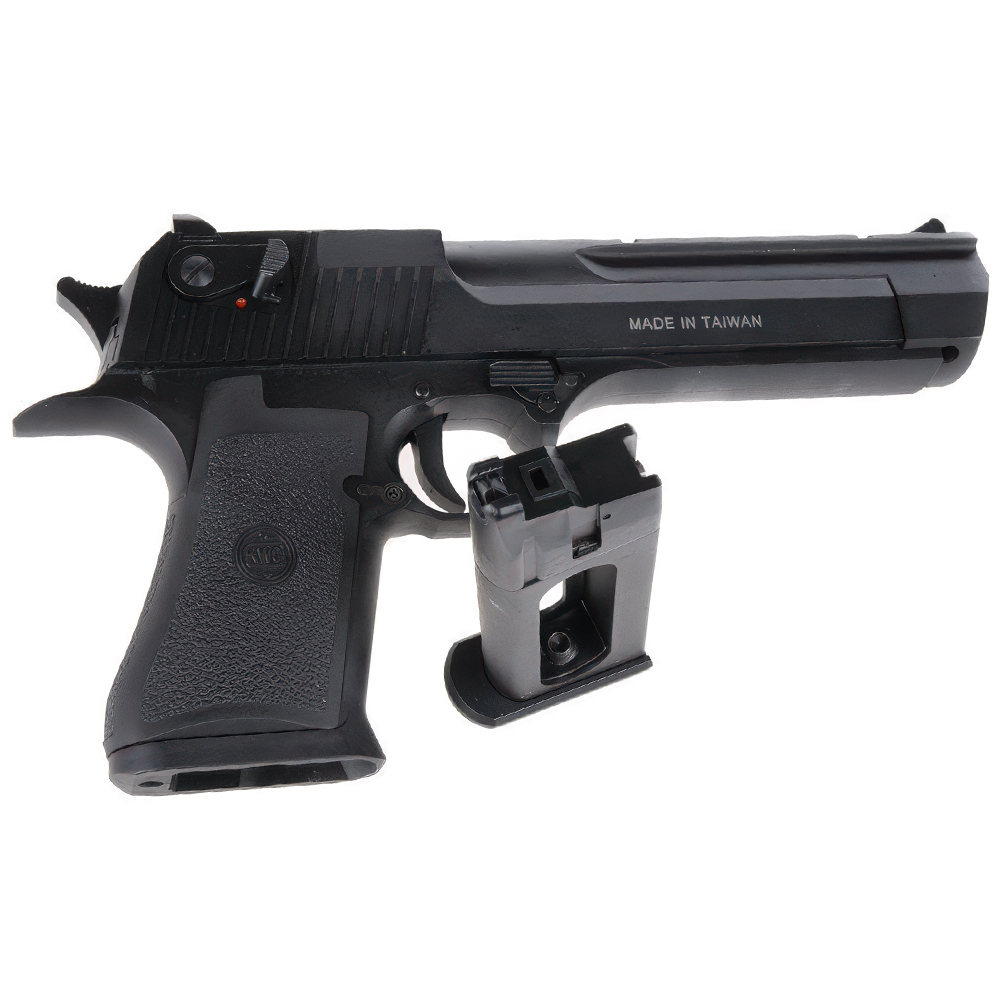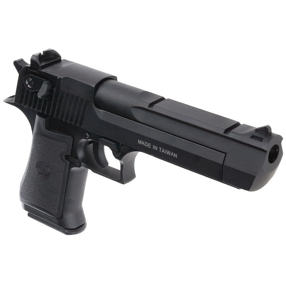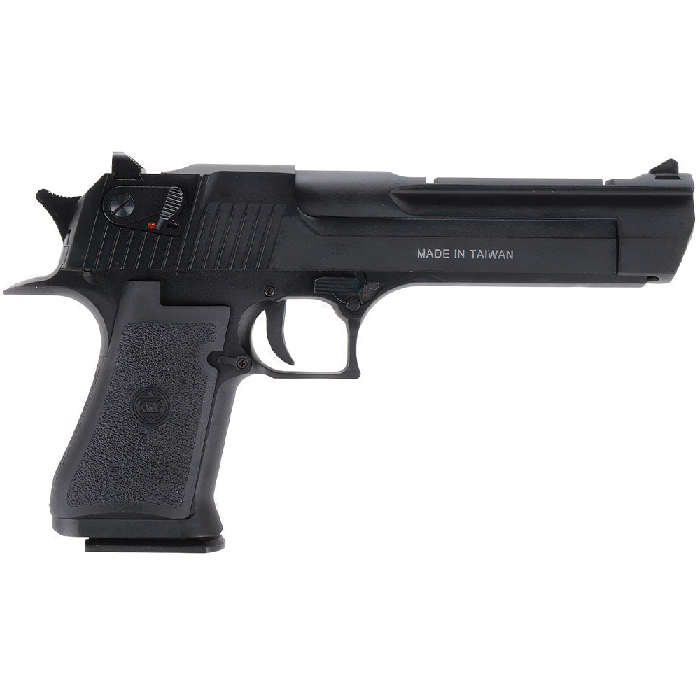 The KWC Desert Eagle .50 is an accurate replica of its real steel counterparts and has full licensing on it for added authenticity. The workings are pretty much just like a real gun with a full-size drop-out magazine and very heavy full blowback operation. The slide gives a nice metallic sound when operating to scare both opponent and ally.