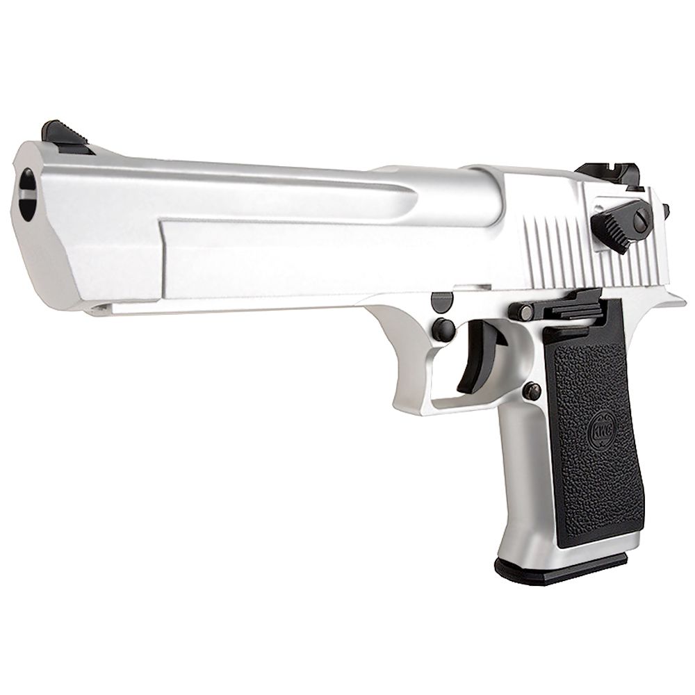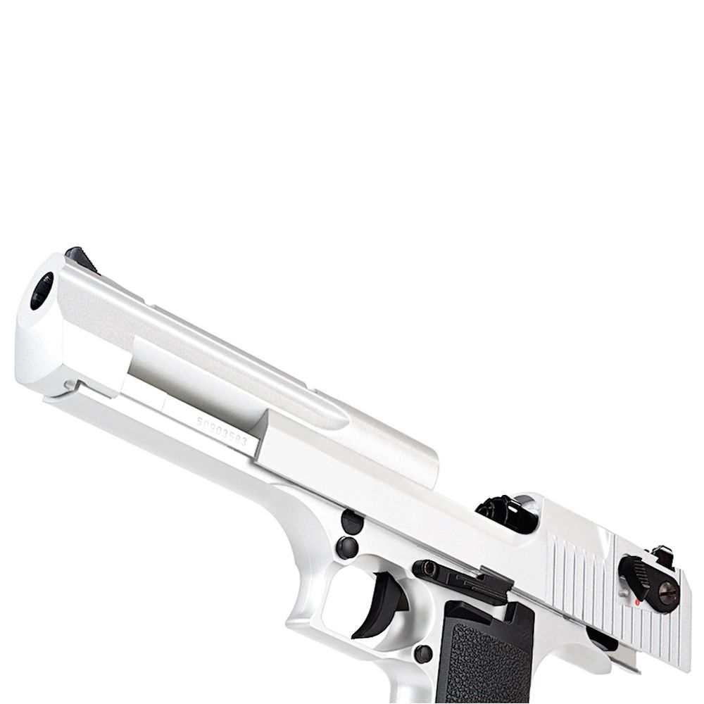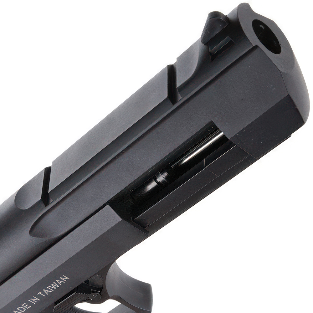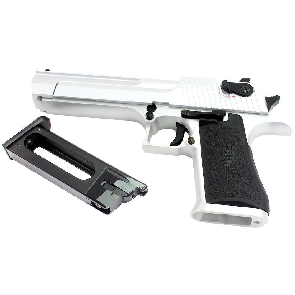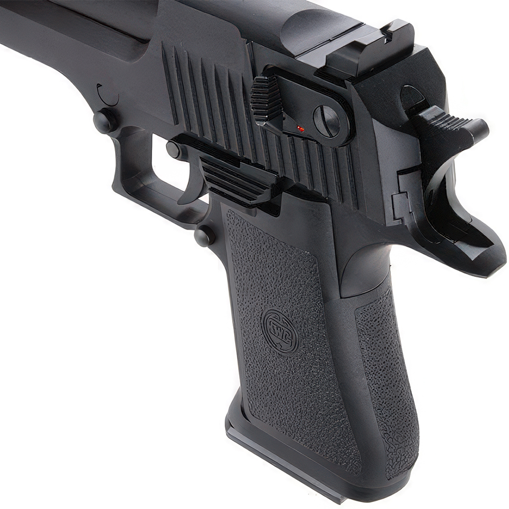 The KWC Desert Eagle .50 is an accurate replica of its real steel counterparts and has full licensing on it for added authenticity. The workings are pretty much just like a real gun with a full-size drop-out magazine and very heavy full blowback operation. The slide gives a nice metallic sound when operating to scare both opponent and ally.