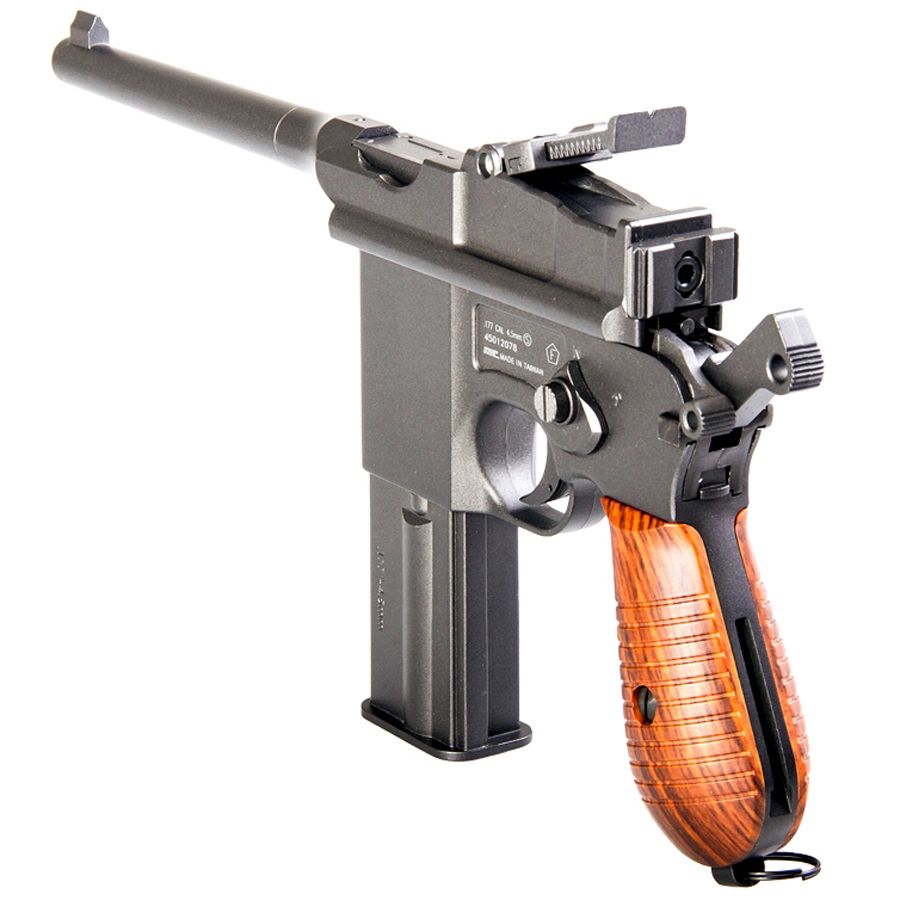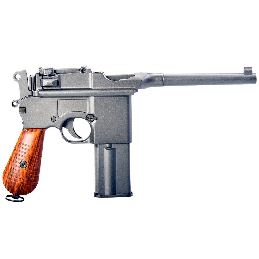 KWC manufactured a full metal blowback version of the Mauser M712 Schnellfeuer pistol. This BB pistol replica shoots over a whopping 400 FPS, with both semi and full-automatic capabilities. It also sports the distinctive broom handle from which the original gun earned its “Broomhandle” nickname.