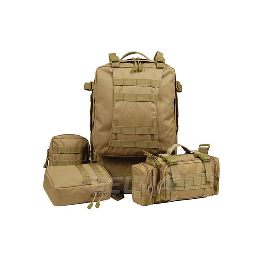 The Backpack is constructed with waterproof 1000D Nylon material. Molle design, molle belt on the front and two sides. Come with a zipper outside pocket and a big mesh compartment in it. With 3 detachable molle pouches attached on front and two sides. Large cargo with a big compartment in it.