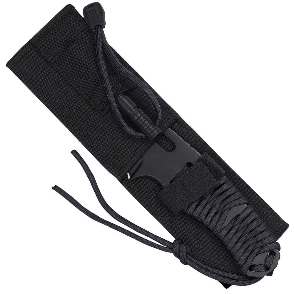 Ultra Force Large Paracord Survival Knife with Fire Starter features a 3¾” 3CR13 stainless steel black slotted blade and paracord wrapped handle that measures 8½” overall. The Paracord survival knife includes a magnesium fire starter w/lanyard, polyester sheath w/hook & loop handle strap & pouch for fire starter. The knife is a great addition to any Bug Out Bag or EDC.
