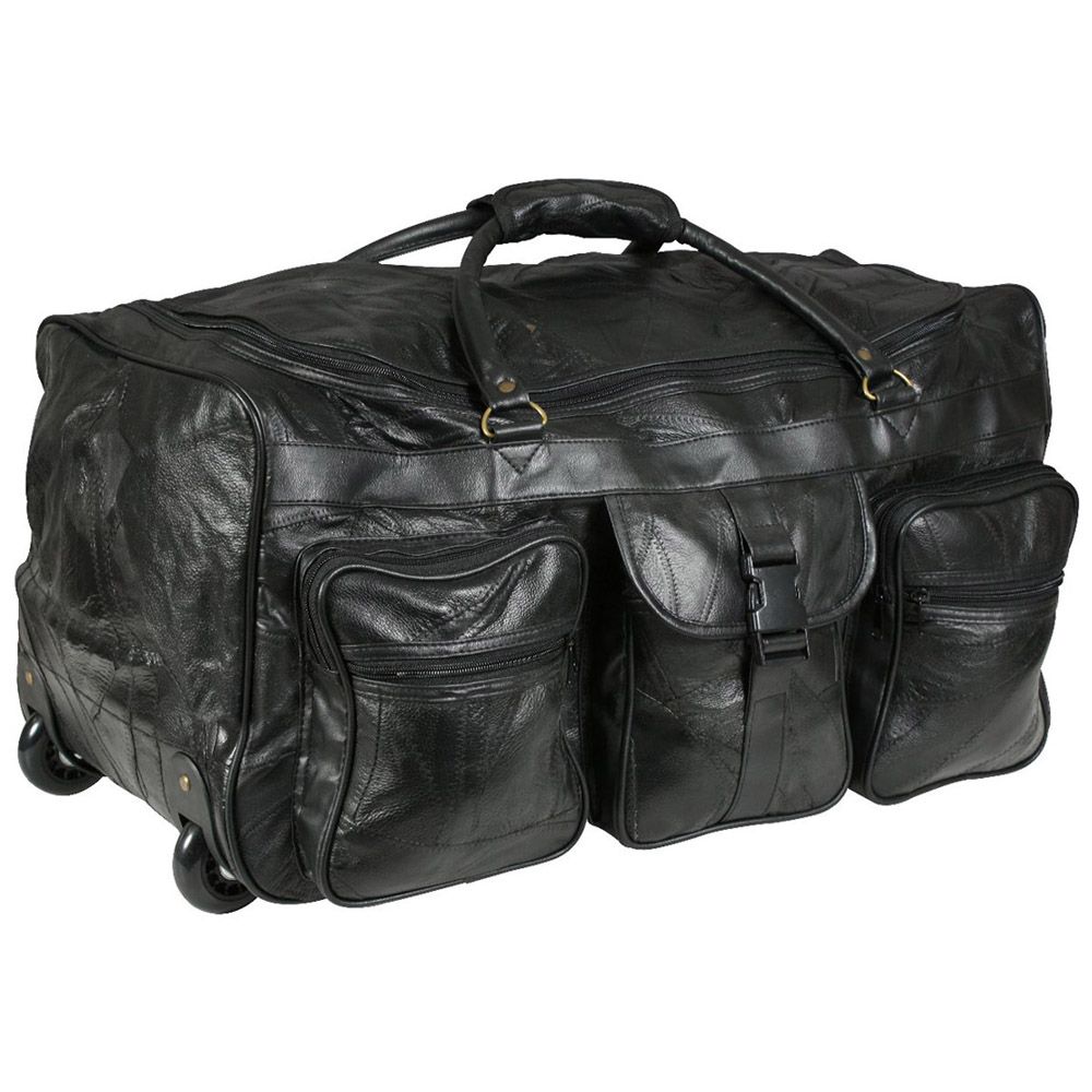 This is a duffel bag model designed to offer maximum convenience. The large dual zipper opening on the top allows for easy storage inside the large main compartment. The bag features grab handles and buckle in the front pocket and two zipper pockets. A unique feature of this leather duffel is the telescoping handle that features a compartment for storage. This 25” bag features attractive leather patchwork and wheels for easy transport. The bag is offered in dimensions 25" X 13" X 12" and is ideal to be carried around for trips. High quality materials are used to make this long-lasting, convenient and comfortable bag.