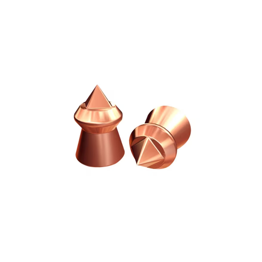Sharp, pyramid-shaped tip to cut and shatter your target. Copper layer for enhanced impact energy. Lead-free material for increased velocity and impact. Aerodynamic shape for excellent flight characteristics.