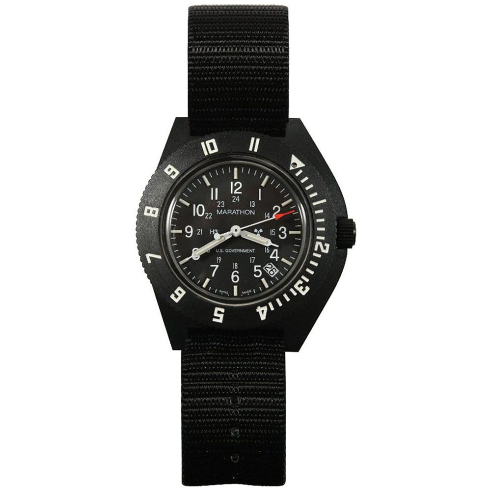 The Marathon Navigator Watch is a highly sturdy and trendy watch made according to military specifications. The watch is water resistant to 200 meters and the stainless steel back also ensures that it is completely dust proof. This makes the watch just ideal for various outdoor activities. Part from this, the watch has classy 24-hour as well as 12-hour analog time scales making it look rather trendy. High torque quartz movement ensures that the watch is accurate and up to the mark at all times. The watch features a black nylon strap which has also been made according to military specifications.