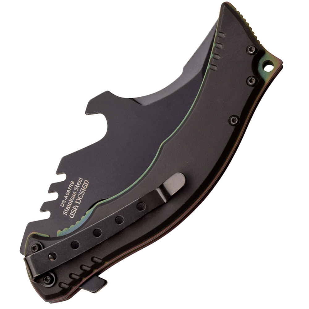 The Dark Sides Folding Knife is a masterful blend of sleek design and reliable performance. Engineered for versatility, this knife features a durable, razor-sharp stainless steel blade, perfect for everyday carry or outdoor adventures. The blade's dark, matte finish adds a touch of mystery and elegance, making it as stylish as it is functional.