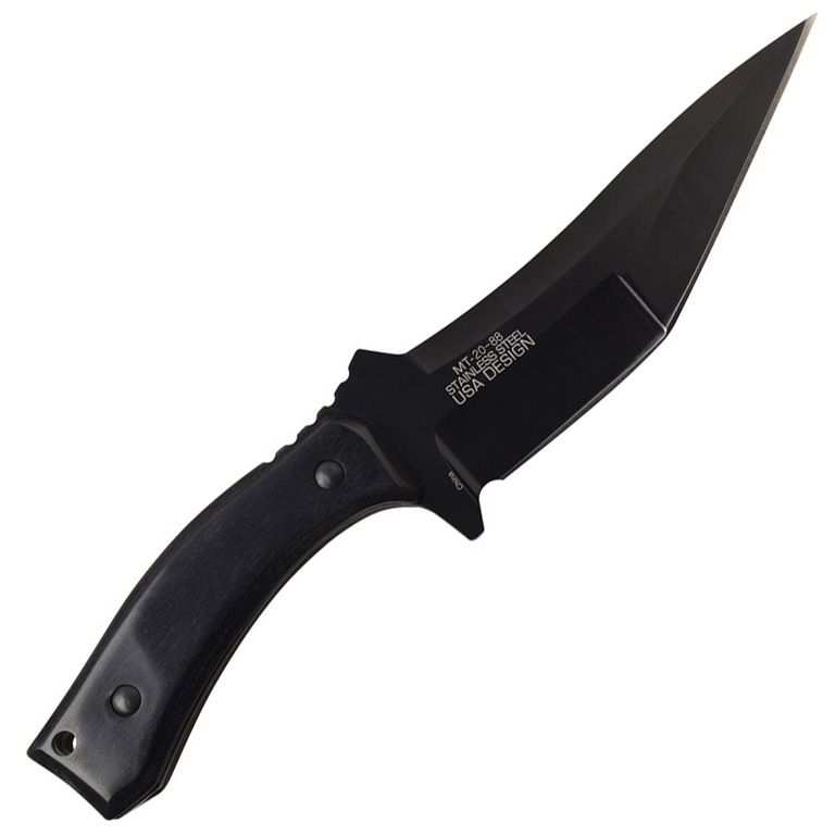 The MTech Upswept Tanto Black features a 6.25″ stainless steel upswept tanto blade with a black coated finish and smooth black pakkawood handles. This full tang fixed blade is .14″ thick with double rivets and a lanyard hole. It’s 11″ overall and includes a black nylon sheath with a belt loop.