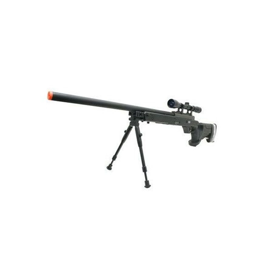 The Mauser Sniper Rifle is a black airsoft rifle with adjustable spin-up and included bipod and scope.